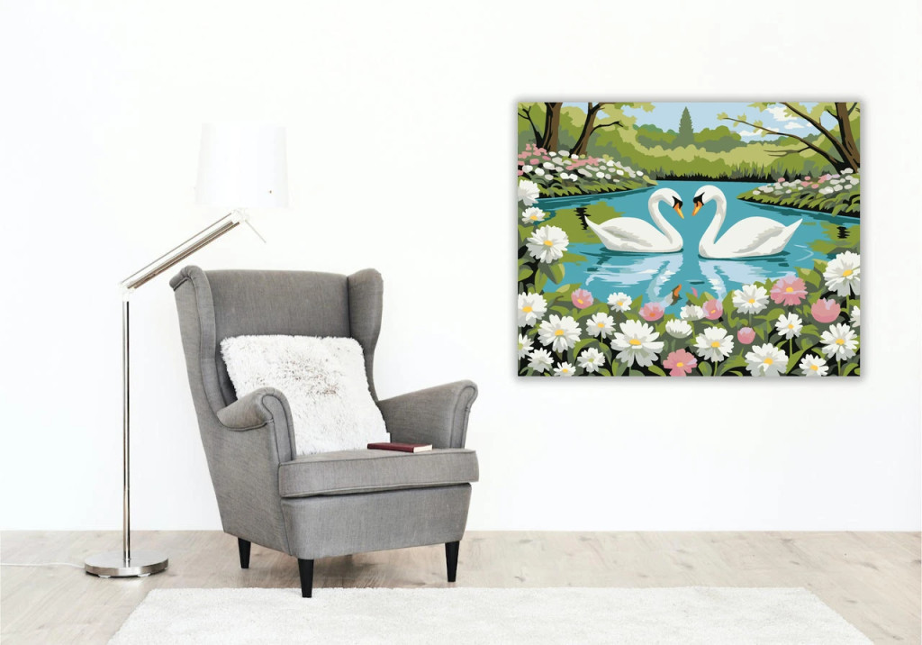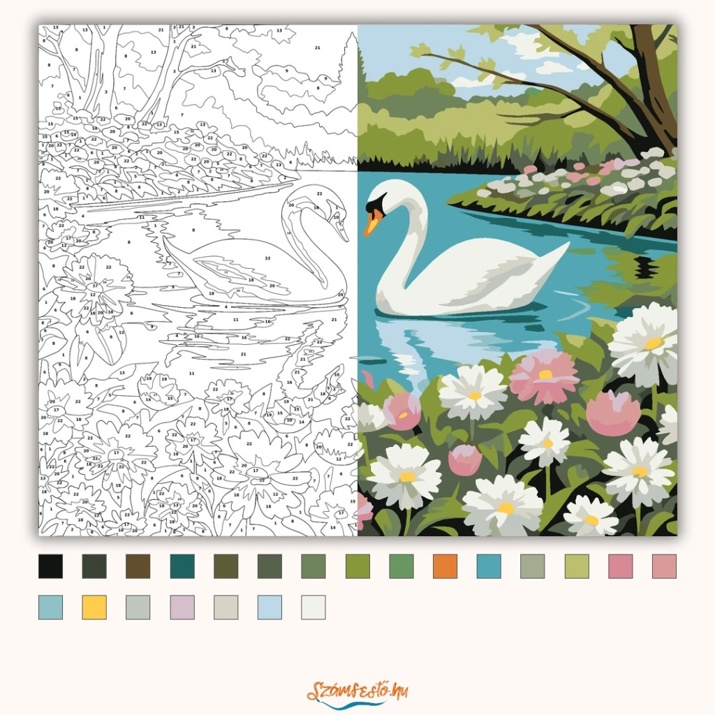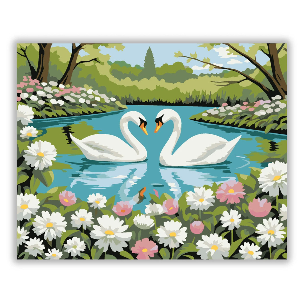 A képen két fehér hattyú úszik egymás felé egy nyugodt tavon, a vízen finom tükröződéssel. A partot tavaszi virágok és dús zöld növények szegélyezik, a háttérben fák és bokrok láthatók. Friss, romantikus hangulatú látvány, sok természetközeli részlettel. Varázsolj egyedi hangulatot otthonodba ezzel a gyönyörű számfestő készlettel, amely tökéletes ajándék is lehet szeretteid számára. A csomag mindent tartalmaz, amire szükséged van ahhoz, hogy saját kezűleg alkoss egy lenyűgöző festményt.