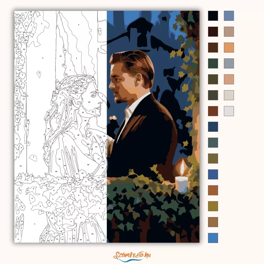 A képen egy fiatal pár áll egymással szemben egy erkélyen, gyertyafény és zöld növények között. Tekintetük mélyen összekapcsolódik, köztük bensőséges, romantikus feszültség érezhető. A háttér sötétebb tónusai és a meleg fények meghitt, időtlen hangulatot teremtenek. A jelenet egy klasszikus szerelmi pillanatot idéz meg, tele érzelemmel és vágyakozással. Díszítsd otthonodat saját kézzel készített műalkotással, vagy ajándékozd meg szeretteidet egy igazán különleges élménnyel! A számfestő készletben minden szükséges eszköz megtalálható a festmény elkészítéséhez.
