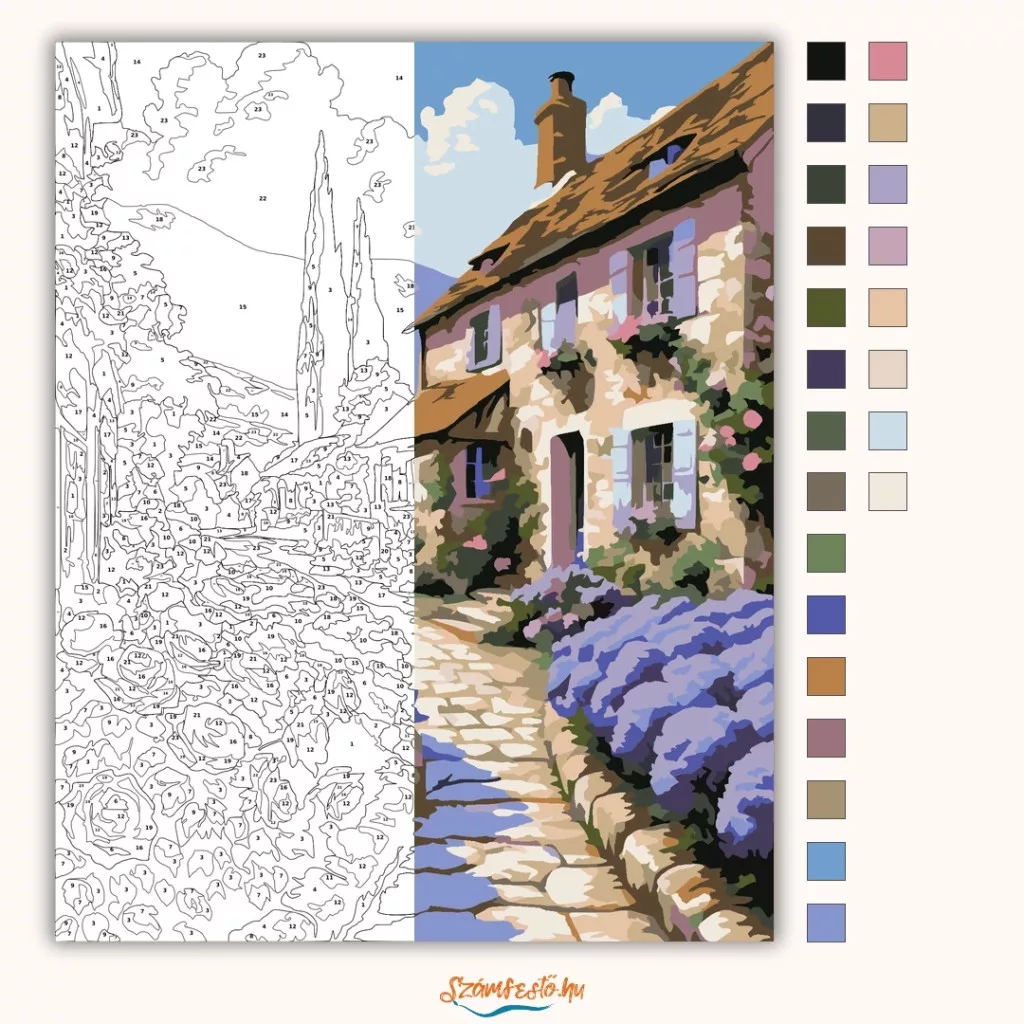 A képen egy kanyargós, köves ösvény vezet végig egy virágokkal szegélyezett falusi utcácskán, kőfalú házak között. A háttérben hegyek és nagy, fehér felhők látszanak, a kertben rózsák és levendulabokrok nyílnak. Nyugodt, napfényes hangulatú jelenet sok természetes részlettel. Varázsolj egyedi hangulatot otthonodba ezzel a gyönyörű számfestő készlettel, amely tökéletes ajándék is lehet szeretteid számára. A csomag mindent tartalmaz, amire szükséged van ahhoz, hogy saját kezűleg alkoss egy lenyűgöző festményt.