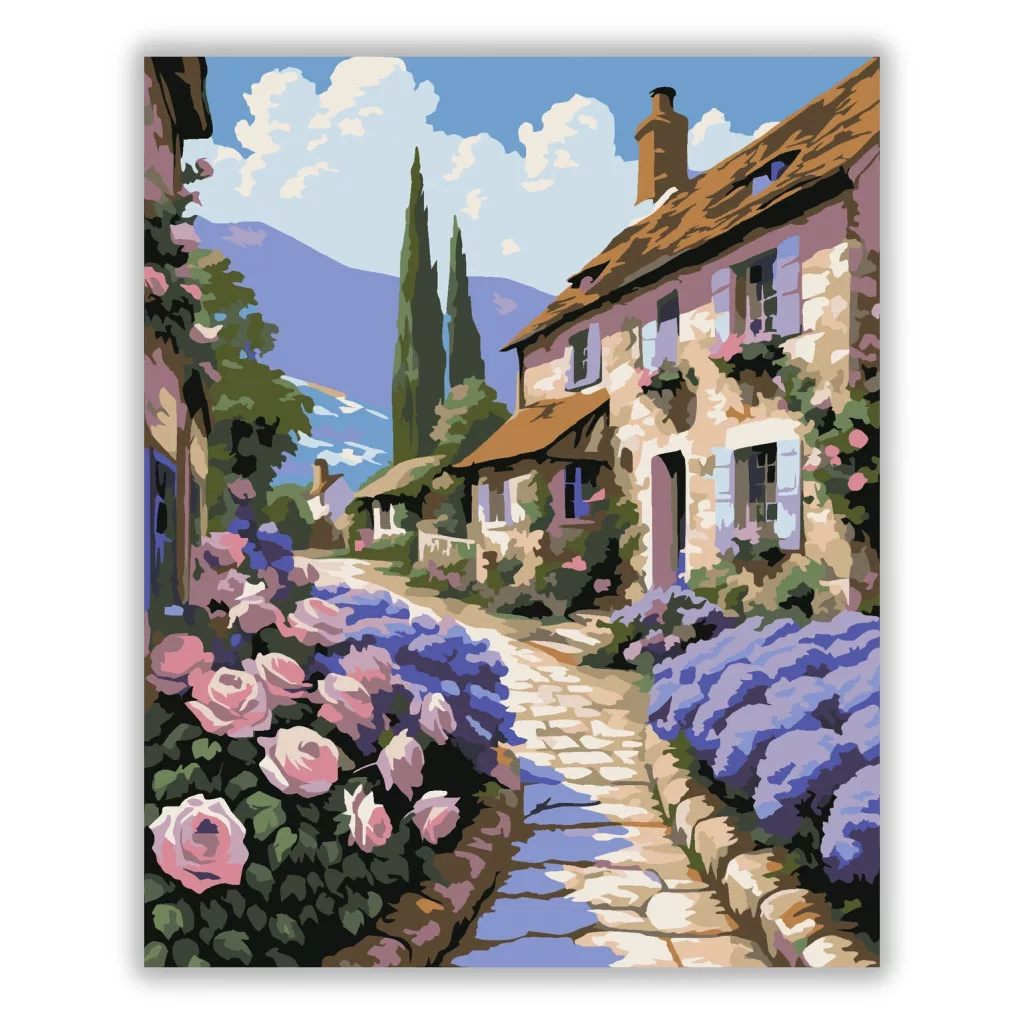 A képen egy kanyargós, köves ösvény vezet végig egy virágokkal szegélyezett falusi utcácskán, kőfalú házak között. A háttérben hegyek és nagy, fehér felhők látszanak, a kertben rózsák és levendulabokrok nyílnak. Nyugodt, napfényes hangulatú jelenet sok természetes részlettel. Engedd szabadjára a kreativitásodat, és alkoss egy különleges műalkotást, amely otthonod dísze lehet de egyedi ajándékként is kiváló. A számfestő készletben minden szükséges eszközt megtalálsz a tökéletes végeredményhez.