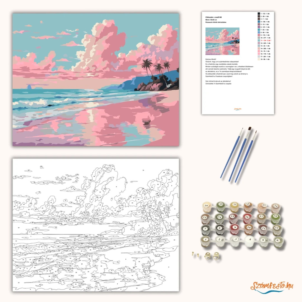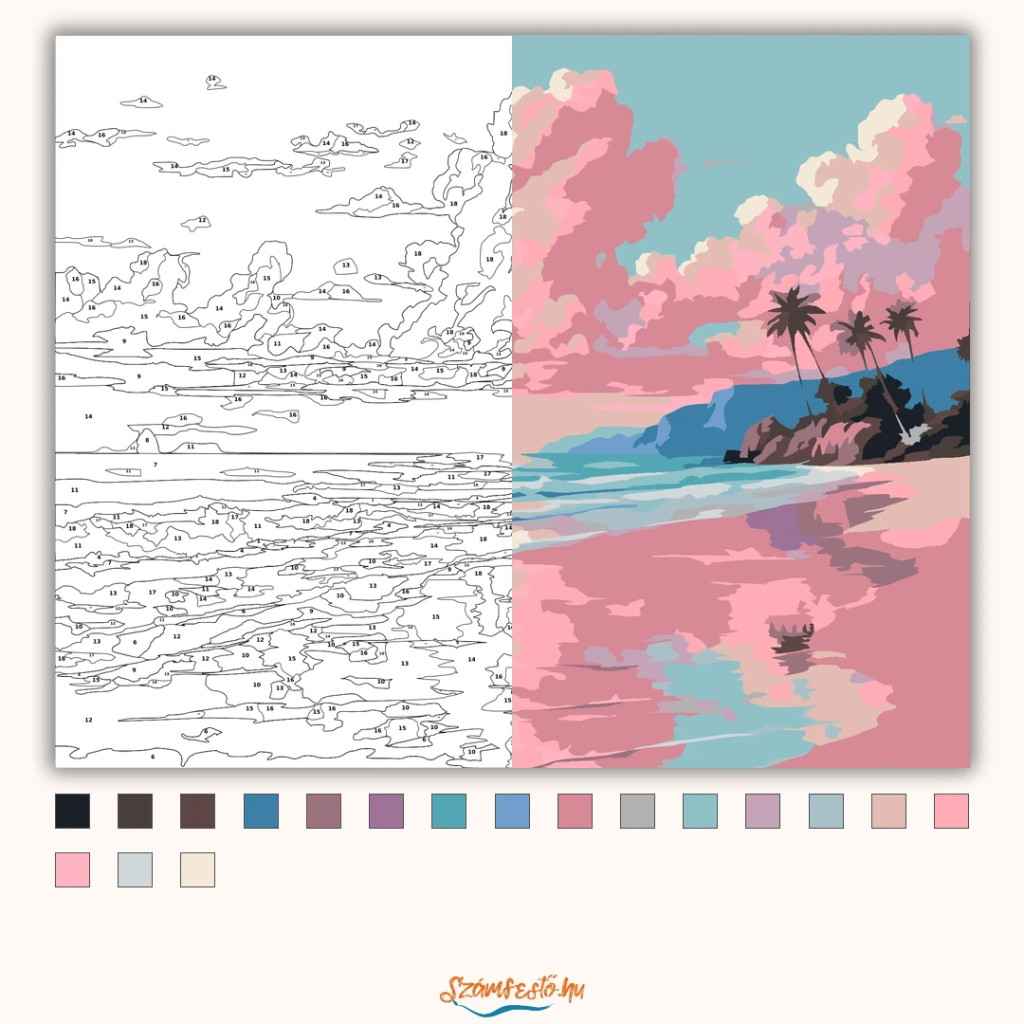 A képen egy nyugodt tengerpart látható, ahol a hullámok a homokos partot mossák. Az égen nagy, rózsaszínes felhők úsznak, amelyek visszatükröződnek a víz felszínén. A távolban egy sziklás part és néhány pálmafa sziluettje teszi teljessé a békés látványt. Legyen a lakásod dísze vagy egy kedves meglepetés valaki számára – ez a számfestő készlet tökéletes választás mindkettőre. A készletben mindent megtalálsz, amivel lépésről lépésre megalkotható ez a gyönyörű festmény.