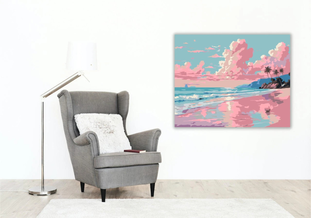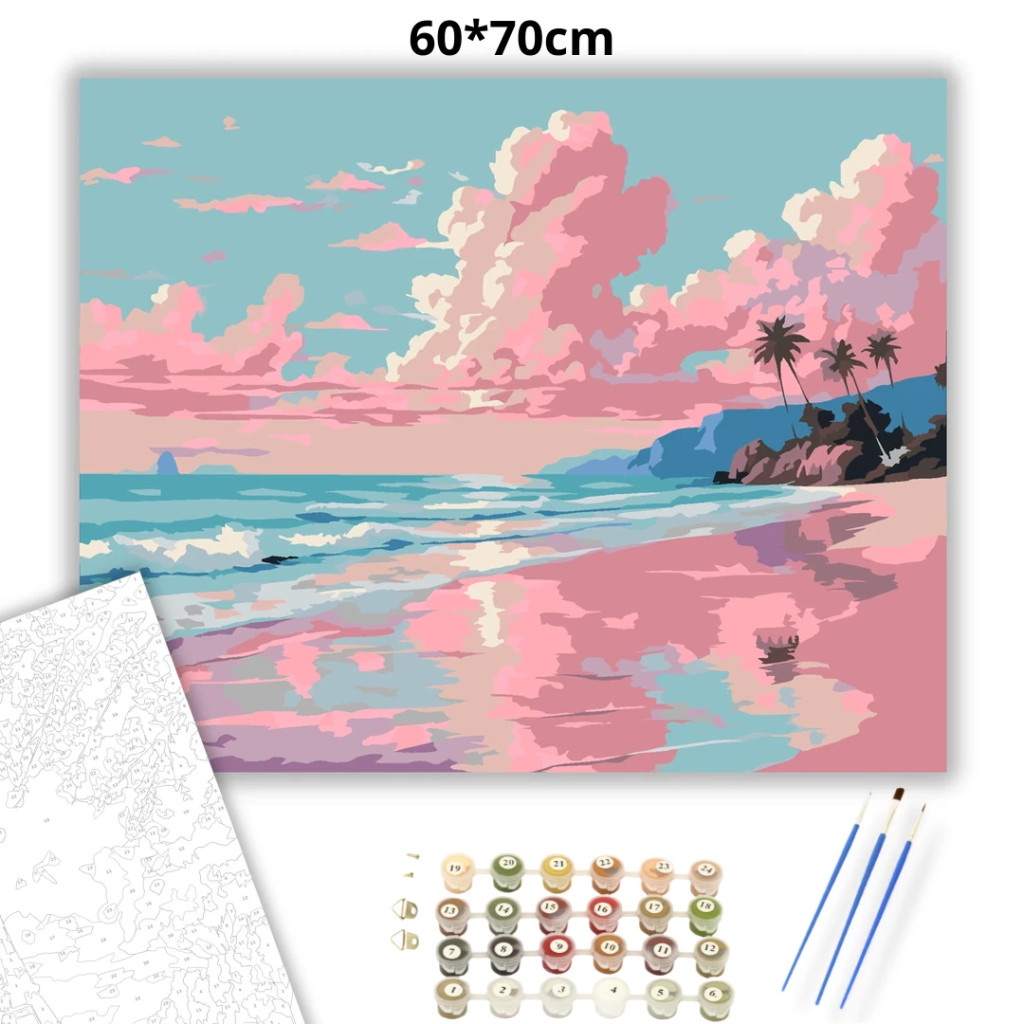 A képen egy nyugodt tengerpart látható, ahol a hullámok a homokos partot mossák. Az égen nagy, rózsaszínes felhők úsznak, amelyek visszatükröződnek a víz felszínén. A távolban egy sziklás part és néhány pálmafa sziluettje teszi teljessé a békés látványt. Ez a számfestő készlet tökéletes választás, ha egyedi dekorációval tennéd szebbé otthonodat, vagy ha különleges ajándékot keresel. A csomagban minden megtalálható, amire a festéshez szükséged van.
