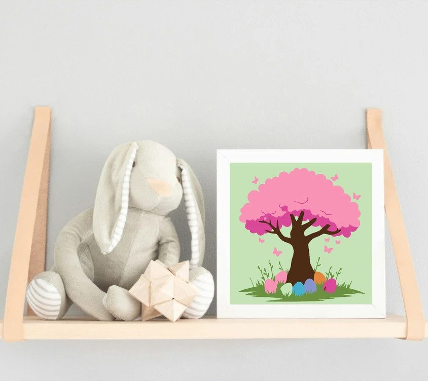 Ezen a képen egy nagy, rózsaszín virágú fa áll a zöld fűben, a törzse mellett színes húsvéti tojásokkal. A levegőben több kis pillangó repked. A rózsaszín, zöld és barna színek dominálnak, vidám tavaszi hangulattal. Varázsolj egyedi hangulatot otthonodba ezzel a gyönyörű számfestő készlettel, amely tökéletes ajándék is lehet szeretteid számára. A csomag mindent tartalmaz, amire szükséged van ahhoz, hogy saját kezűleg alkoss egy lenyűgöző festményt.