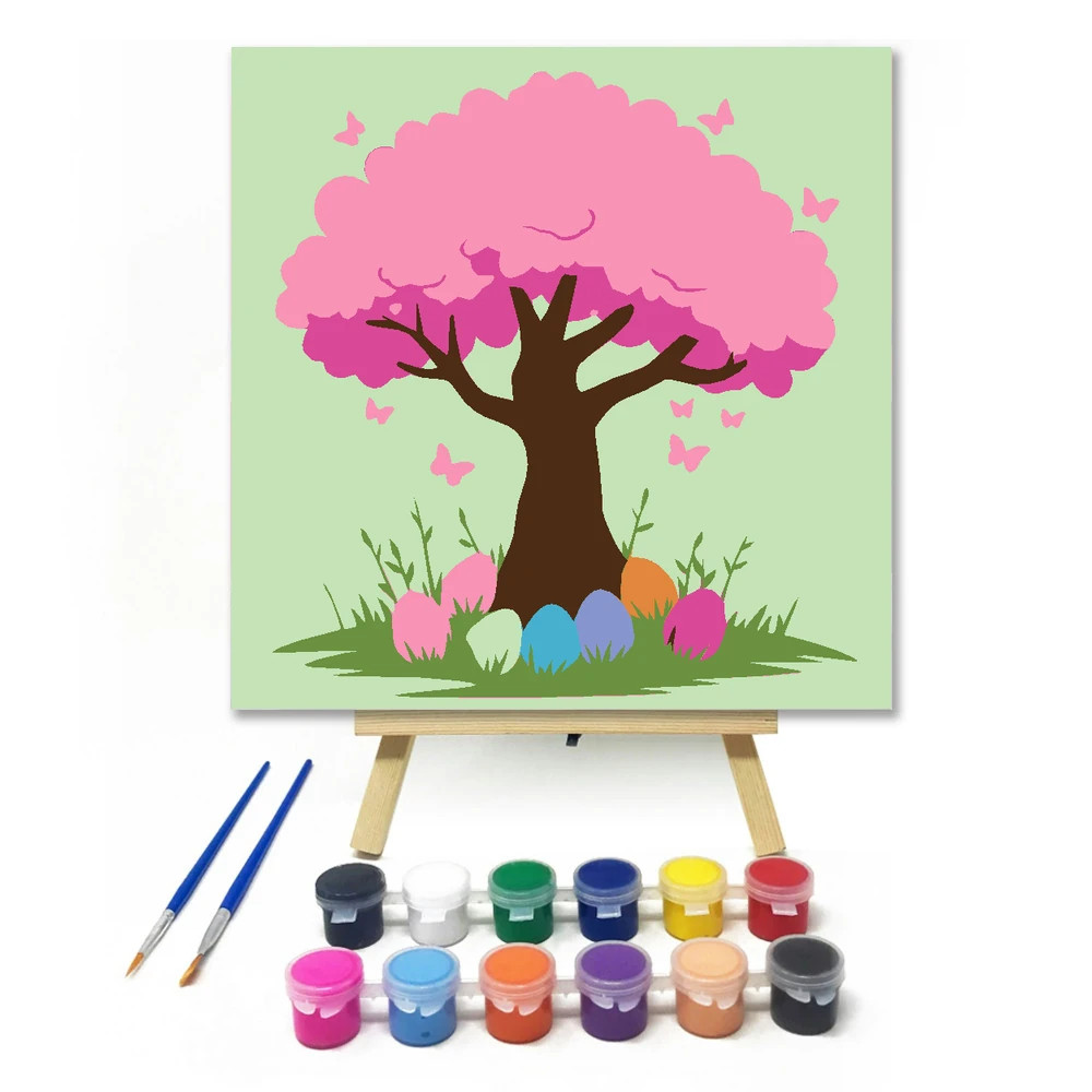 Ezen a képen egy nagy, rózsaszín virágú fa áll a zöld fűben, a törzse mellett színes húsvéti tojásokkal. A levegőben több kis pillangó repked. A rózsaszín, zöld és barna színek dominálnak, vidám tavaszi hangulattal. Ez a számfestő készlet tökéletes választás, ha egyedi dekorációval tennéd szebbé otthonodat, vagy ha különleges ajándékot keresel. A csomagban minden megtalálható, amire a festéshez szükséged van.