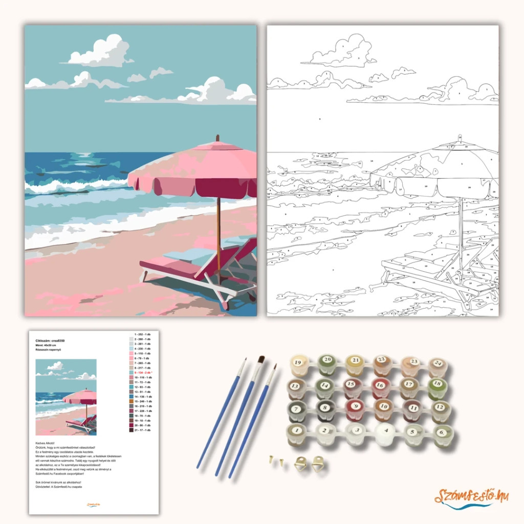 A képen egy nyugodt tengerpart látható lágy hullámokkal és fehér felhőkkel a világos ég alatt. Előtérben egy rózsaszín napernyő és egy napozóágy áll a homokban, igazi nyári pihenős hangulatot teremtve. Legyen a lakásod dísze vagy egy kedves meglepetés valaki számára – ez a számfestő készlet tökéletes választás mindkettőre. A készletben mindent megtalálsz, amivel lépésről lépésre megalkotható ez a gyönyörű festmény.