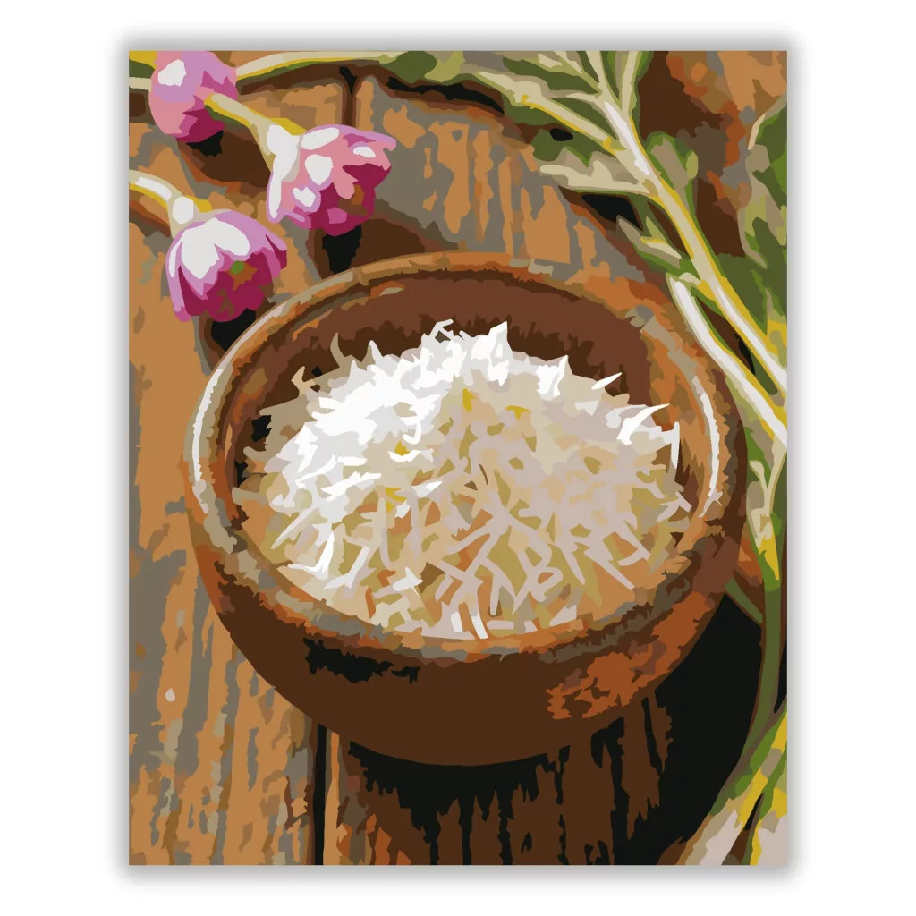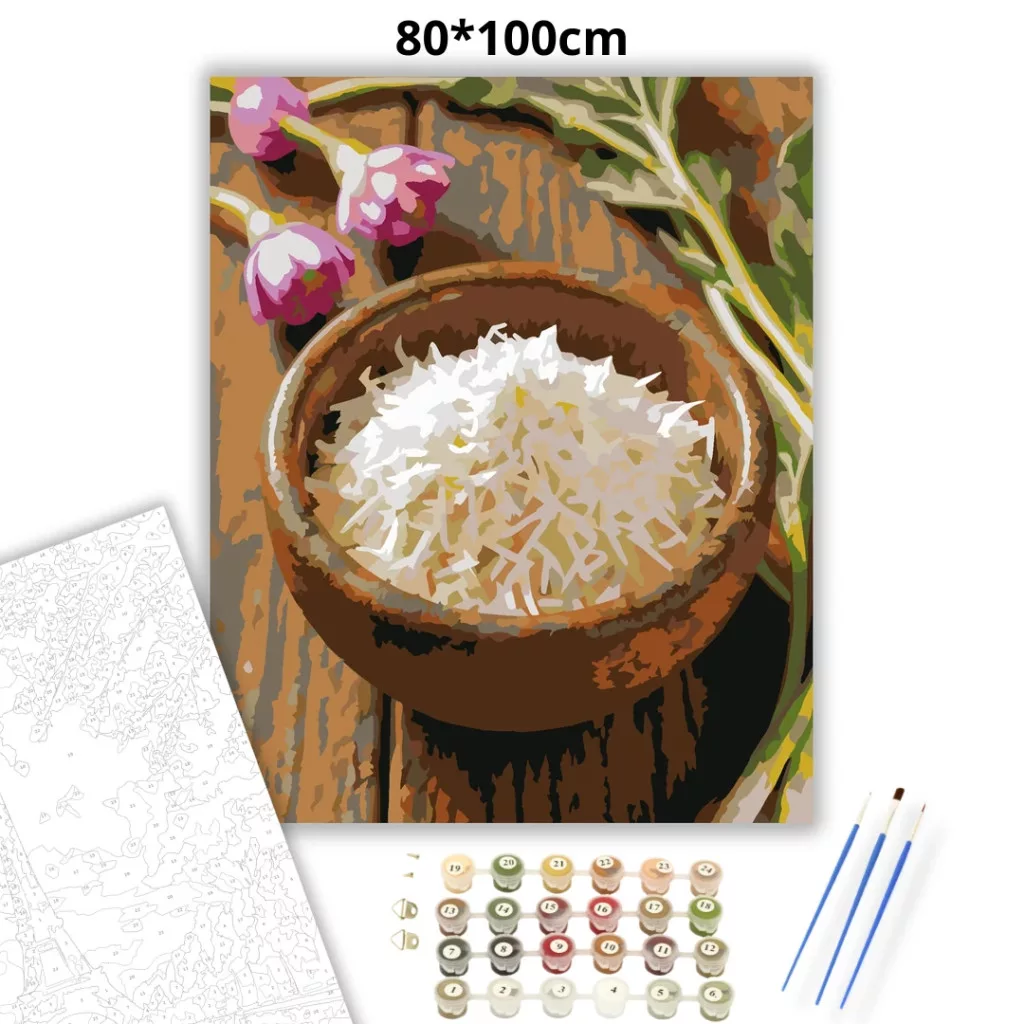 A képen egy kis rusztikus tál látható frissen reszelt tormával, fa asztalon. A háttérben lila virágok és zöld levelek jelennek meg, otthonos, természetközeli hangulatot adva. A meleg földszínek és a világos torma kontrasztja különösen figyelemfelkeltő. Ez a számfestő készlet tökéletes választás, ha egyedi dekorációval tennéd szebbé otthonodat, vagy ha különleges ajándékot keresel. A csomagban minden megtalálható, amire a festéshez szükséged van.