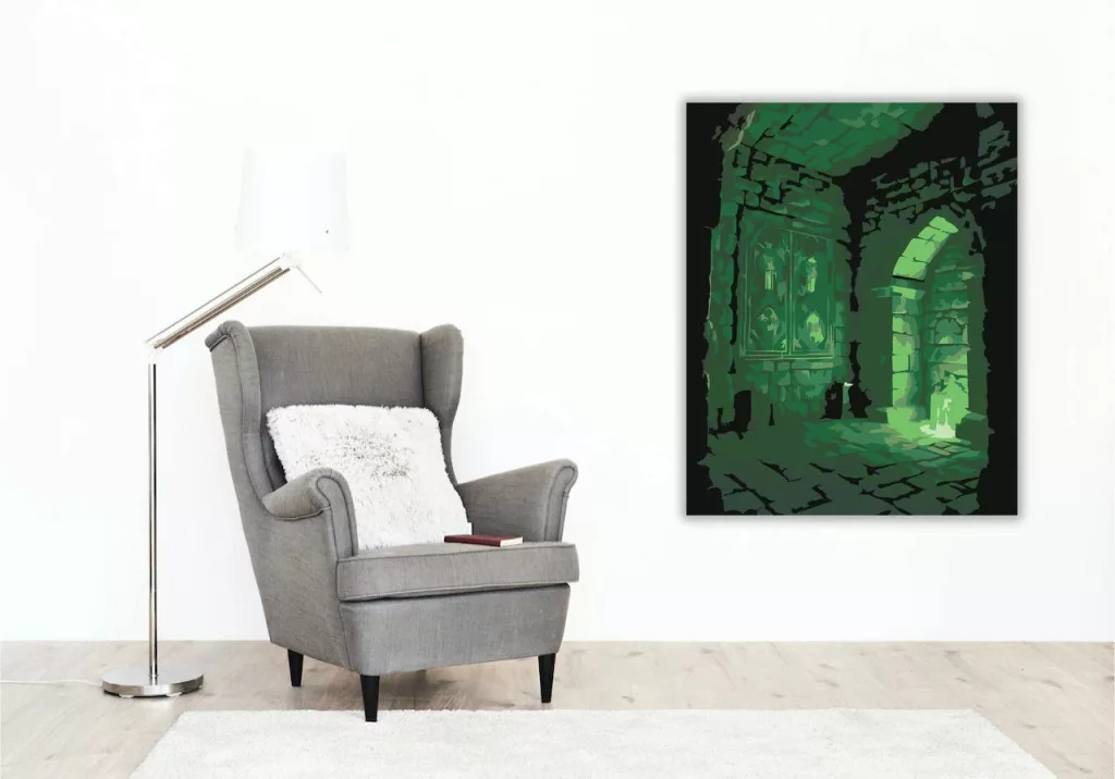 Egy rejtett kőkamra látható, ahol a falakat zölden derengő jelek világítják meg. A sötétben a kőboltozat és a boltíves átjáró titokzatos hangulatot ad. A zöld fényekkel átjárt, árnyékos tér igazi varázslatos rejtekhelynek hat. Ez a számfestő készlet tökéletes választás, ha egyedi dekorációval tennéd szebbé otthonodat, vagy ha különleges ajándékot keresel. A csomagban minden megtalálható, amire a festéshez szükséged van.