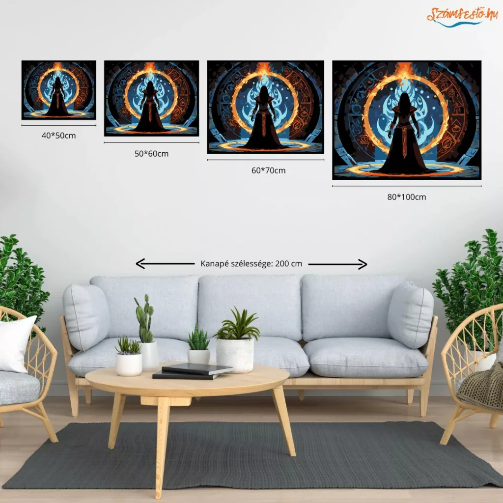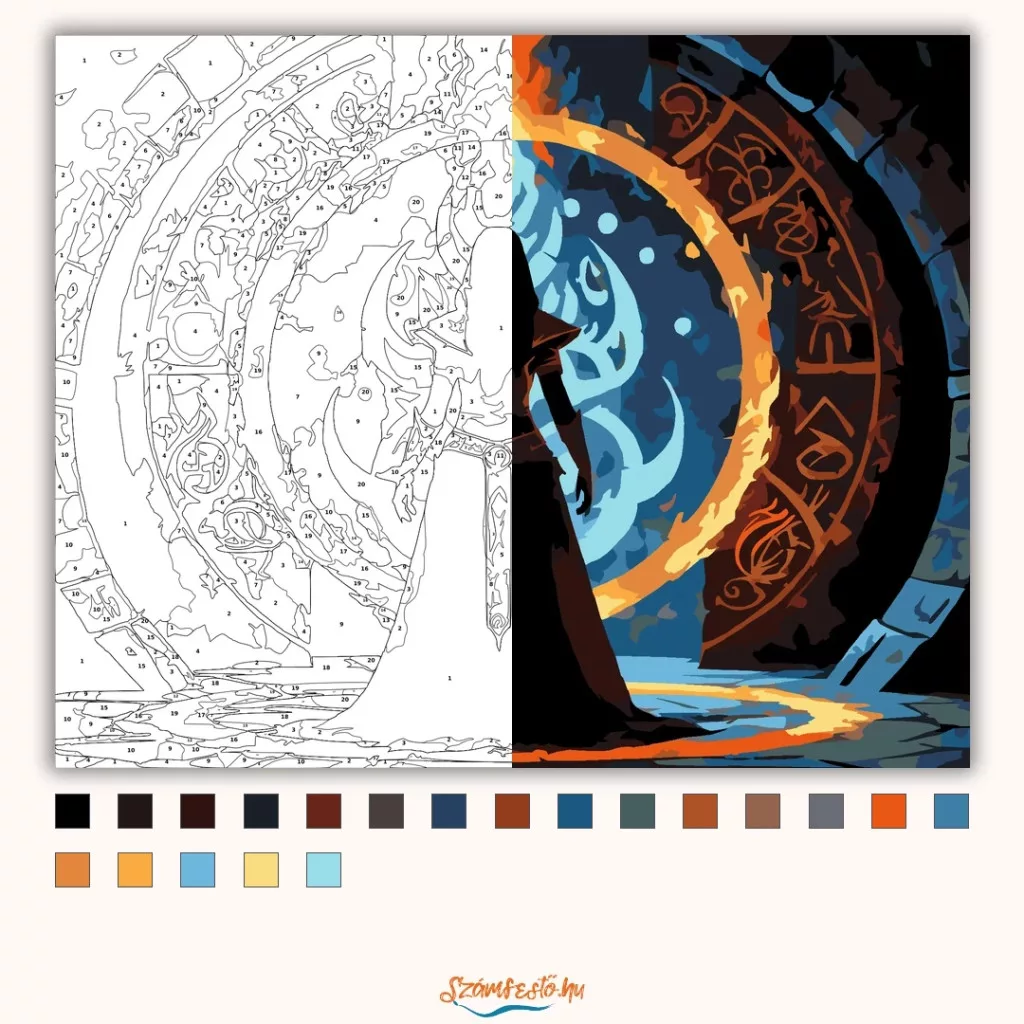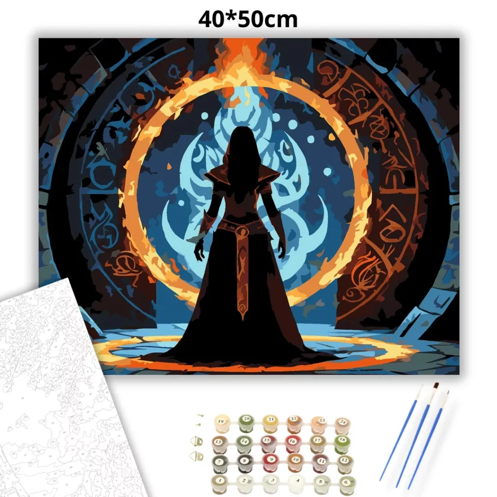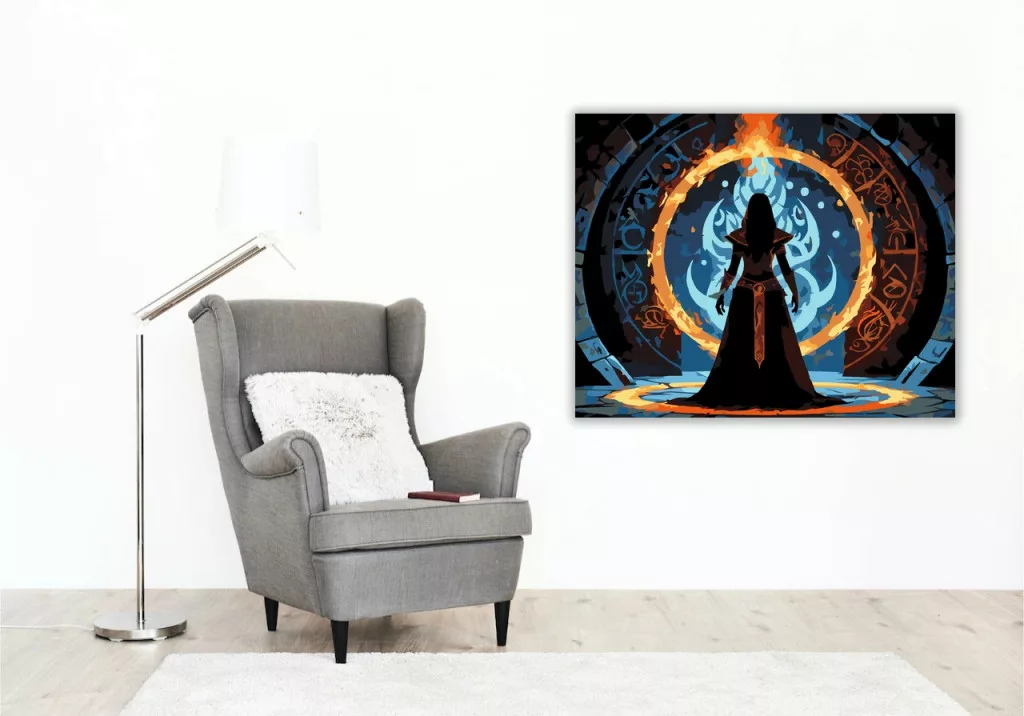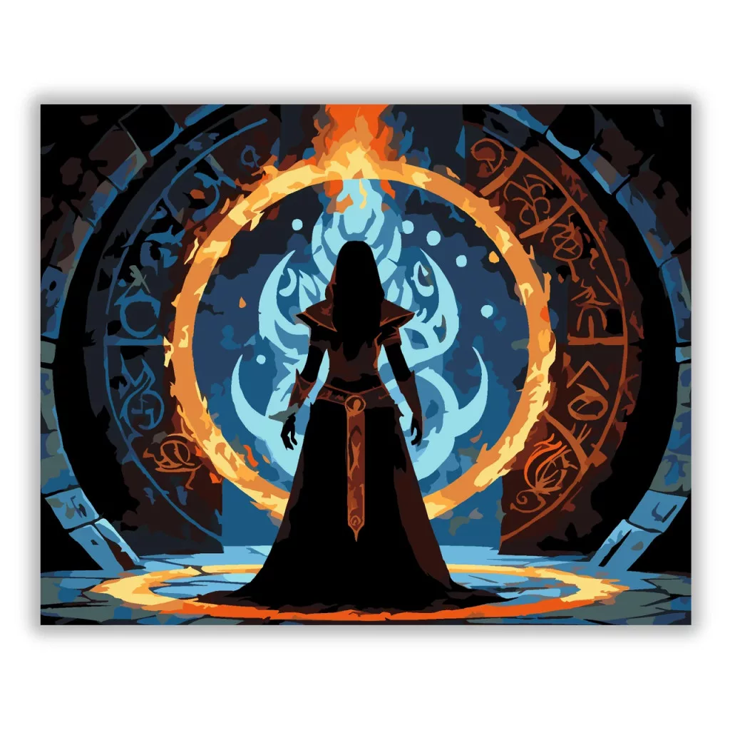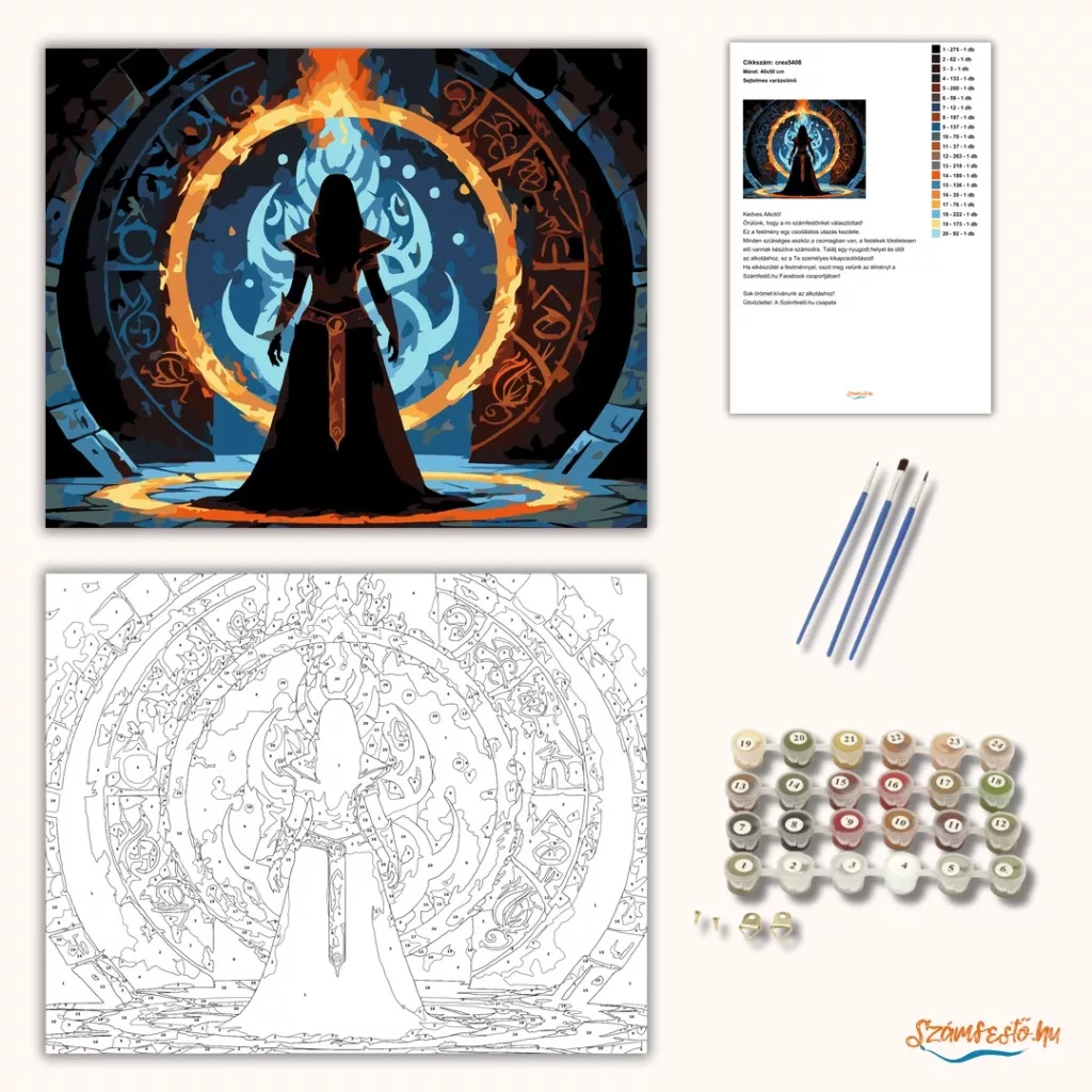 A képen egy sötét varázslónő sziluettje áll egy hatalmas, lángoló gyűrű előtt, amelyet ősi jelek és rúnák vesznek körül. A háttérben kékes, örvénylő fény ragyog, mögötte árnyalakok sejtelmesen kirajzolódnak. A jelenet misztikus és feszült hangulatú, erős tűz- és éjszakai tónusokkal. Engedd szabadjára a kreativitásodat, és alkoss egy különleges műalkotást, amely otthonod dísze lehet de egyedi ajándékként is kiváló. A számfestő készletben minden szükséges eszközt megtalálsz a tökéletes végeredményhez.
