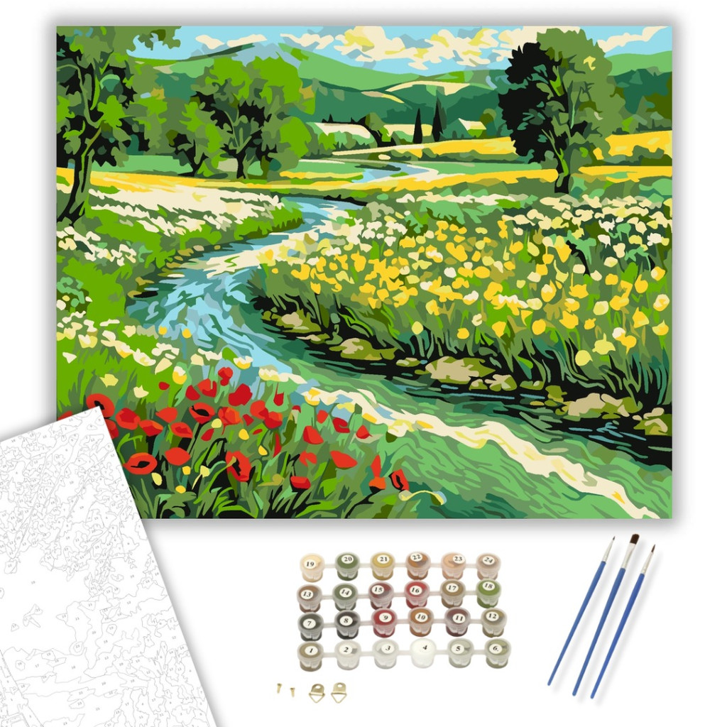 A festmény egy idilli tájat ábrázol, ahol a folyópart mentén élénk virágok borítják a mezőt, megidézve a természet varázsát. A gazdag színpaletta és a lendületes ecsetvonások dinamikus kompozíciót teremtenek, mely az adott művészeti stílus jegyeit hordozza. A kép tökéletesen visszaadja a stílus érzelmi intenzitását és vizuális erejét. Ez a számfestő készlet tökéletes választás, ha egyedi dekorációval tennéd szebbé otthonodat, vagy ha különleges ajándékot keresel. A csomagban minden megtalálható, amire a festéshez szükséged van.