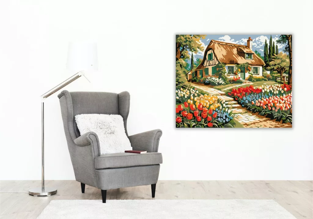 Számfestő készlet – Virágos Kunyhó Idillje – 40×50 cm (Keret nélkül)