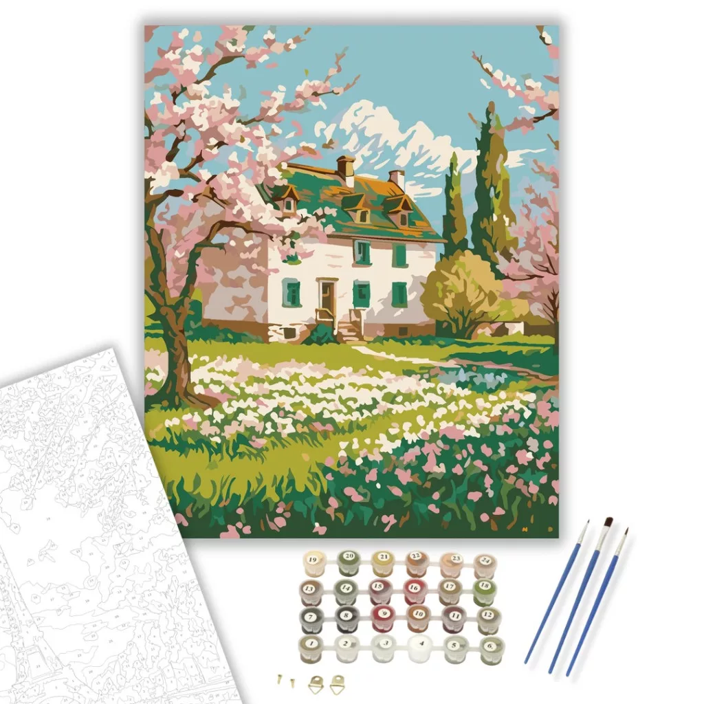 A festmény egy idilli vidéki házat ábrázol virágzó cseresznyefákkal körülvéve, a természet újjászületésének pillanatában. Az élénk rózsaszín és zöld színek, valamint a lágy ecsetvonások a tavaszi frissességet és életörömöt sugározzák. A kompozíció a Van Gogh által inspirált művészi stílus érzelmi gazdagságát és dinamikáját idézi meg. Engedd szabadjára a kreativitásodat, és alkoss egy különleges műalkotást, amely otthonod dísze lehet de egyedi ajándékként is kiváló. A számfestő készletben minden szükséges eszközt megtalálsz a tökéletes végeredményhez.