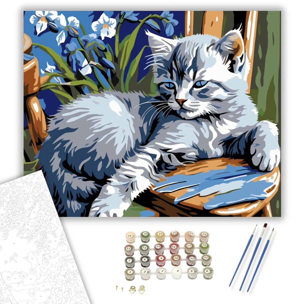 A festmény egy pihenő macskát ábrázol virágzó íriszekkel körülvéve, mely a természet nyugalmát tükrözi. Az élénk kékek és zöldek kontrasztja lendületes ecsetvonásokkal párosul, megidézve a stílus dinamikus színhasználatát. A kompozíció hűen tükrözi a művészi irányzat érzelmi gazdagságát és kifejező erejét. Engedd szabadjára a kreativitásodat, és alkoss egy különleges műalkotást, amely otthonod dísze lehet de egyedi ajándékként is kiváló. A számfestő készletben minden szükséges eszközt megtalálsz a tökéletes végeredményhez.