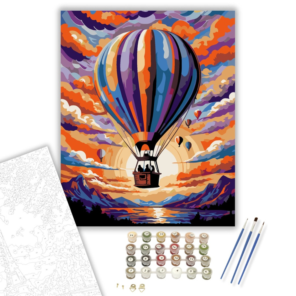 A festmény egy lélegzetelállító légi utazást ábrázol, ahol a hőlégballonok varázslatos égbolt alatt lebegnek. A kép élénk színei és dinamikus ecsetvonásai kiemelik a naplemente varázsát és a hegyek körvonalait. Ez a kompozíció tökéletesen megidézi a Van Gogh inspirálta művészi stílus gazdag érzelemvilágát és látványos színkavalkádját. Varázsolj egyedi hangulatot otthonodba ezzel a gyönyörű számfestő készlettel, amely tökéletes ajándék is lehet szeretteid számára. A csomag mindent tartalmaz, amire szükséged van ahhoz, hogy saját kezűleg alkoss egy lenyűgöző festményt.
