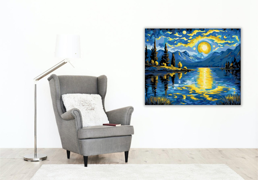 A festmény egy hegyi tavat ábrázol, amely felett a naplemente varázslatos fényjátéka terül el, Van Gogh stílusában. Az élénk sárga és hűvös kék tónusok kontrasztja, valamint a lendületes ecsetvonások dinamikus hatást kölcsönöznek a tájnak. A kompozíció hűen idézi meg a művész expresszív látásmódját és a természet lenyűgöző szépségét. Engedd szabadjára a kreativitásodat, és alkoss egy különleges műalkotást, amely otthonod dísze lehet de egyedi ajándékként is kiváló. A számfestő készletben minden szükséges eszközt megtalálsz a tökéletes végeredményhez.