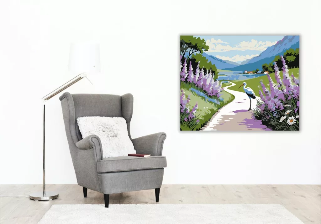 A festmény egy békés vidéki tájat ábrázol, ahol egy gólya sétál a lila virágokkal szegélyezett ösvényen, a háttérben hegyek és egy csendes tó látható. Az élénk, kontrasztos színek és a finom ecsetkezelés kiemelik a természet idilli szépségét és nyugalmát. A kompozíció Van Gogh világát idézi meg, ahol a színek és formák harmóniája lenyűgöző hatást kelt. Legyen a lakásod dísze vagy egy kedves meglepetés valaki számára – ez a számfestő készlet tökéletes választás mindkettőre. A készletben mindent megtalálsz, amivel lépésről lépésre megalkotható ez a gyönyörű festmény.