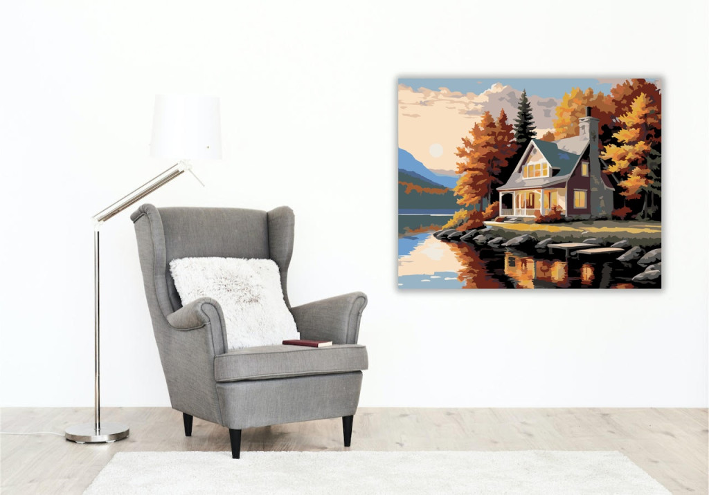 Számfestő készlet – Őszi Tóparti Házikó – 60×70 cm (Keretre feszítve)