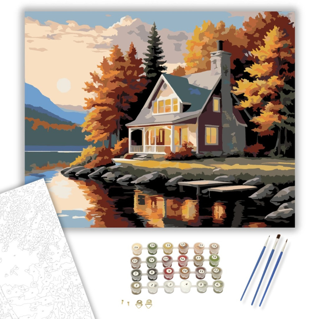 A festmény egy őszi színekben pompázó tóparti házikót ábrázol, amelynek kéménye kőből készült. Az ablakokból meleg, aranyló fény árad, miközben a nap lenyugszik a távolban. A kép meghittséget és nyugalmat sugároz, az őszi természet szépségét idézve. Varázsolj egyedi hangulatot otthonodba ezzel a gyönyörű számfestő készlettel, amely tökéletes ajándék is lehet szeretteid számára. A csomag mindent tartalmaz, amire szükséged van ahhoz, hogy saját kezűleg alkoss egy lenyűgöző festményt.