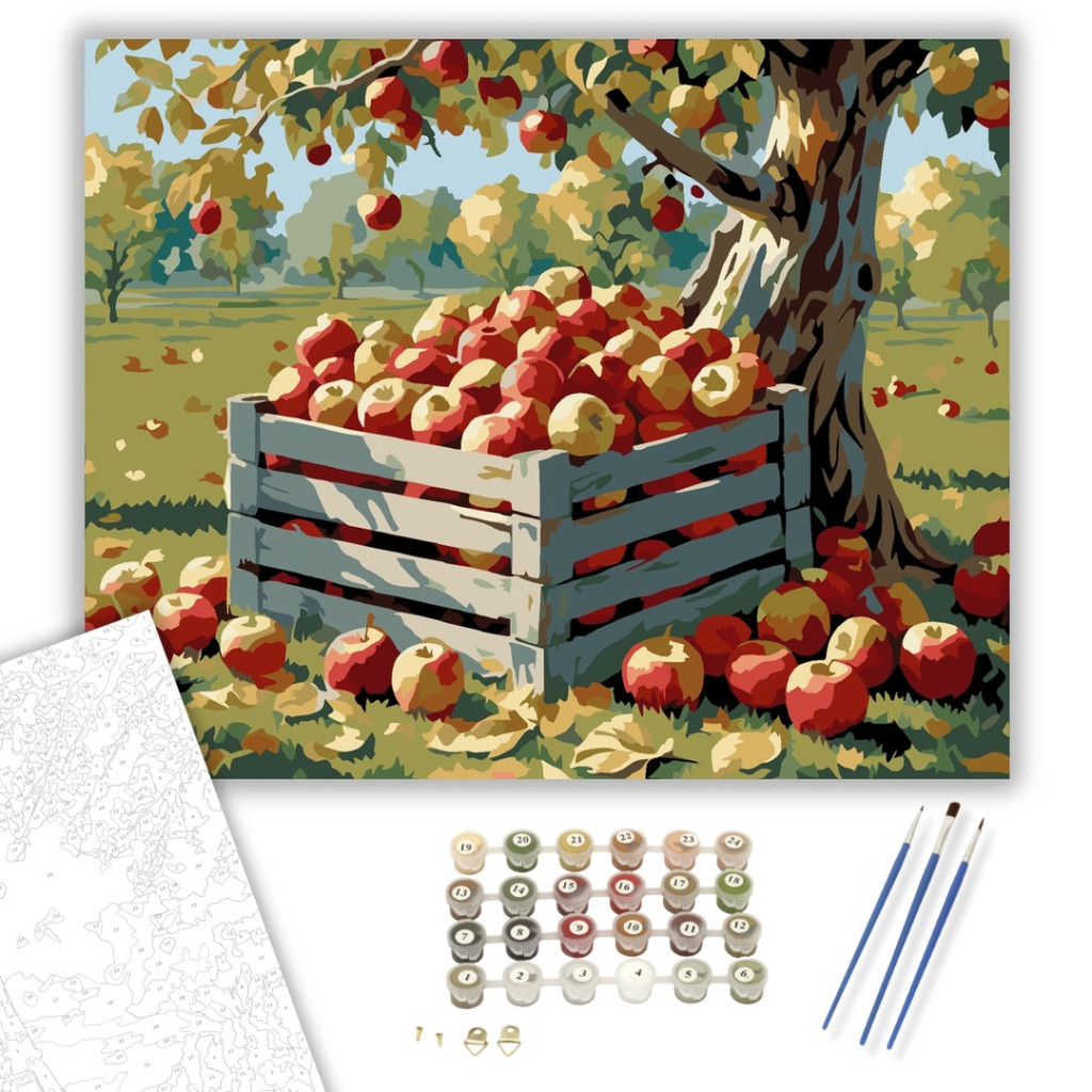 A festmény egy napsütötte almáskertben elhelyezkedő, frissen szüretelt almákkal teli faládát ábrázol, háttérben egy öreg almafával. A piros és sárga almák, valamint a lehullott levelek meleg őszi színekben ragyognak. A kép az ősz gazdagságát és a természet bőséges ajándékait idézi. Ez a számfestő készlet tökéletes választás, ha egyedi dekorációval tennéd szebbé otthonodat, vagy ha különleges ajándékot keresel. A csomagban minden megtalálható, amire a festéshez szükséged van.