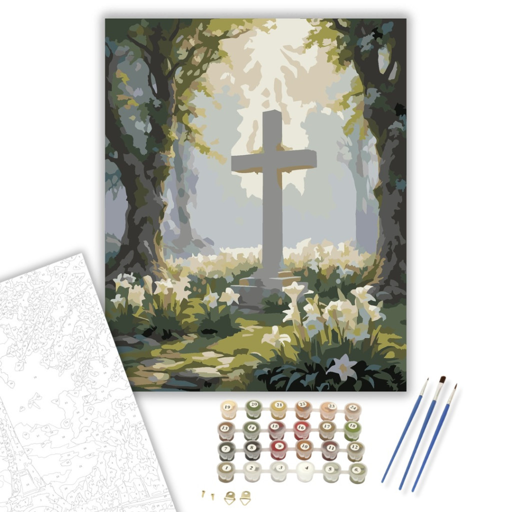 A festmény egy húsvéti reggelen ábrázolja az üres keresztet, melyet liliomok ölelnek körül. A nap sugarai áttörnek a reggeli ködön, meleg aranyfénybe burkolva a jelenetet. A kép az újjászületés és a remény érzését közvetíti, békét és spirituális megnyugvást sugallva. Legyen a lakásod dísze vagy egy kedves meglepetés valaki számára – ez a számfestő készlet tökéletes választás mindkettőre. A készletben mindent megtalálsz, amivel lépésről lépésre megalkotható ez a gyönyörű festmény.