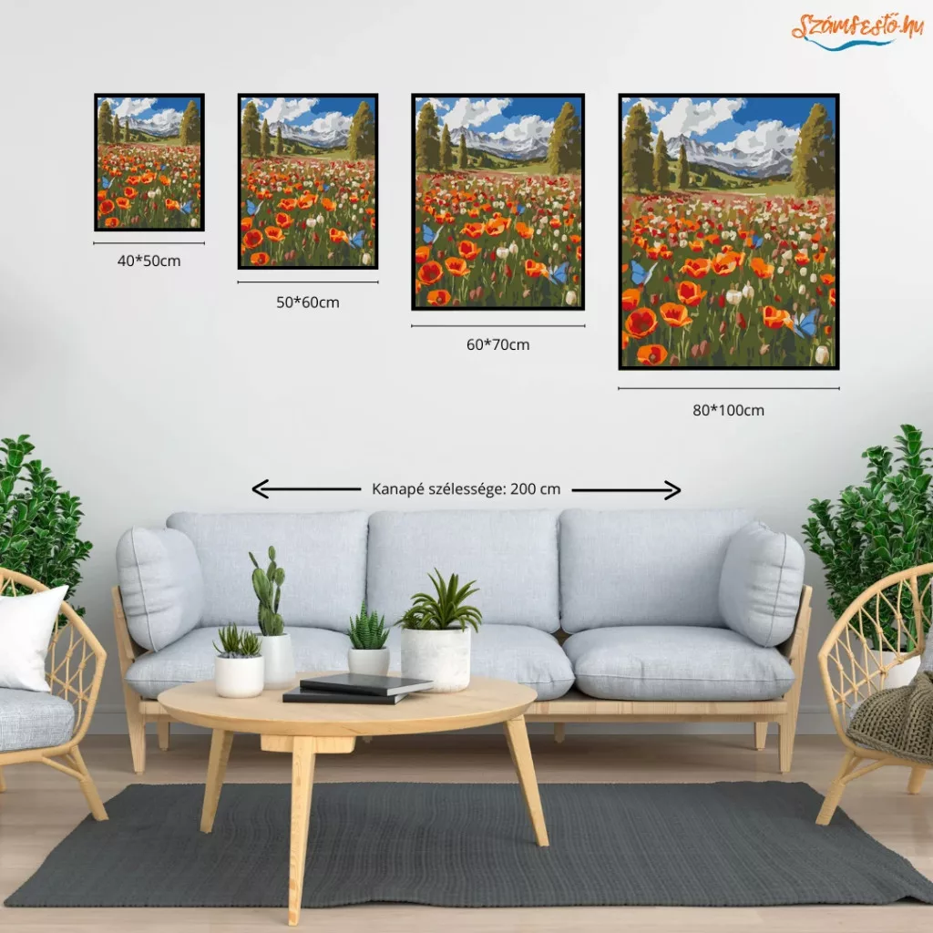 A képen egy hegyekkel övezett tavaszi rét látható, tele vad tulipánokkal és pipacsokkal. A távolban havas csúcsok és nagy, fehér felhők adják a friss, nyitott táj hangulatát. A virágok között több pillangó is repül, ami még élőbbé teszi a jelenetet. Varázsolj egyedi hangulatot otthonodba ezzel a gyönyörű számfestő készlettel, amely tökéletes ajándék is lehet szeretteid számára. A csomag mindent tartalmaz, amire szükséged van ahhoz, hogy saját kezűleg alkoss egy lenyűgöző festményt.
