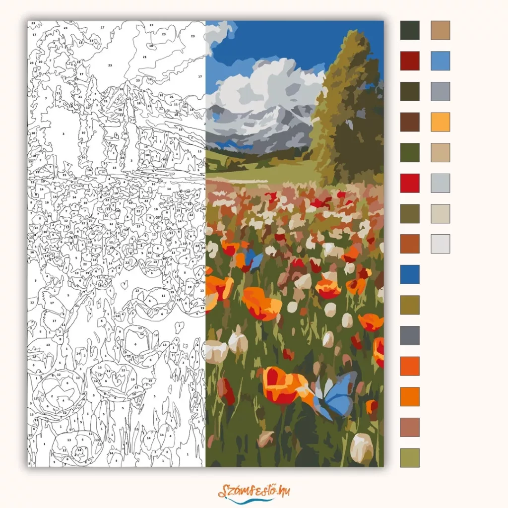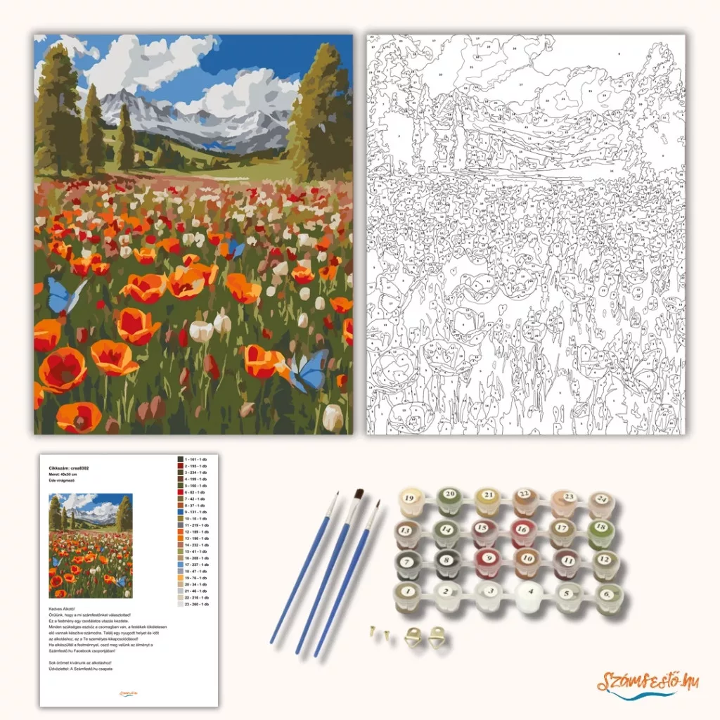 A képen egy hegyekkel övezett tavaszi rét látható, tele vad tulipánokkal és pipacsokkal. A távolban havas csúcsok és nagy, fehér felhők adják a friss, nyitott táj hangulatát. A virágok között több pillangó is repül, ami még élőbbé teszi a jelenetet. Varázsolj egyedi hangulatot otthonodba ezzel a gyönyörű számfestő készlettel, amely tökéletes ajándék is lehet szeretteid számára. A csomag mindent tartalmaz, amire szükséged van ahhoz, hogy saját kezűleg alkoss egy lenyűgöző festményt.