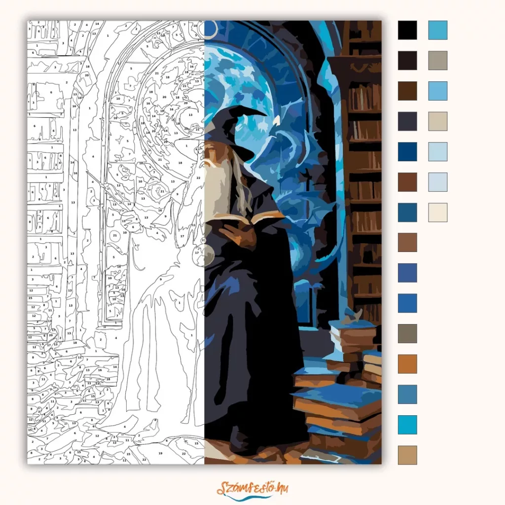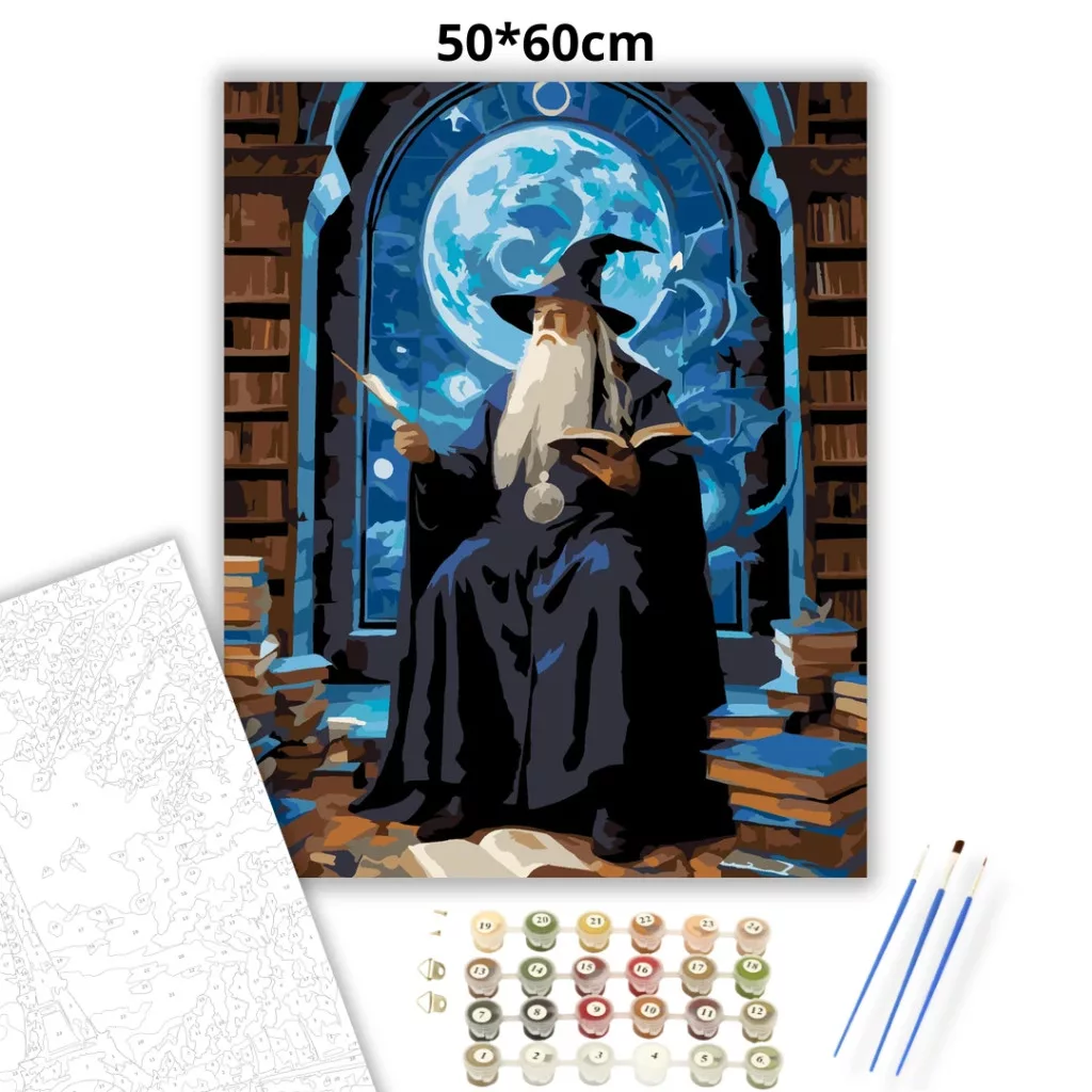 A képen egy idős varázsló ül egy torony könyvtárában, hosszú ezüst szakállal és hegyes kalapban, kezében pálcával és nyitott könyvvel. Körülötte könyvespolcok és könyvkupacok láthatók, a háttérben pedig egy hatalmas, kékesen fénylő hold ragyog az ablakon át. A jelenet misztikus, mesés hangulatú, hűvös kék tónusokkal és sötét árnyékokkal. Varázsolj egyedi hangulatot otthonodba ezzel a gyönyörű számfestő készlettel, amely tökéletes ajándék is lehet szeretteid számára. A csomag mindent tartalmaz, amire szükséged van ahhoz, hogy saját kezűleg alkoss egy lenyűgöző festményt.