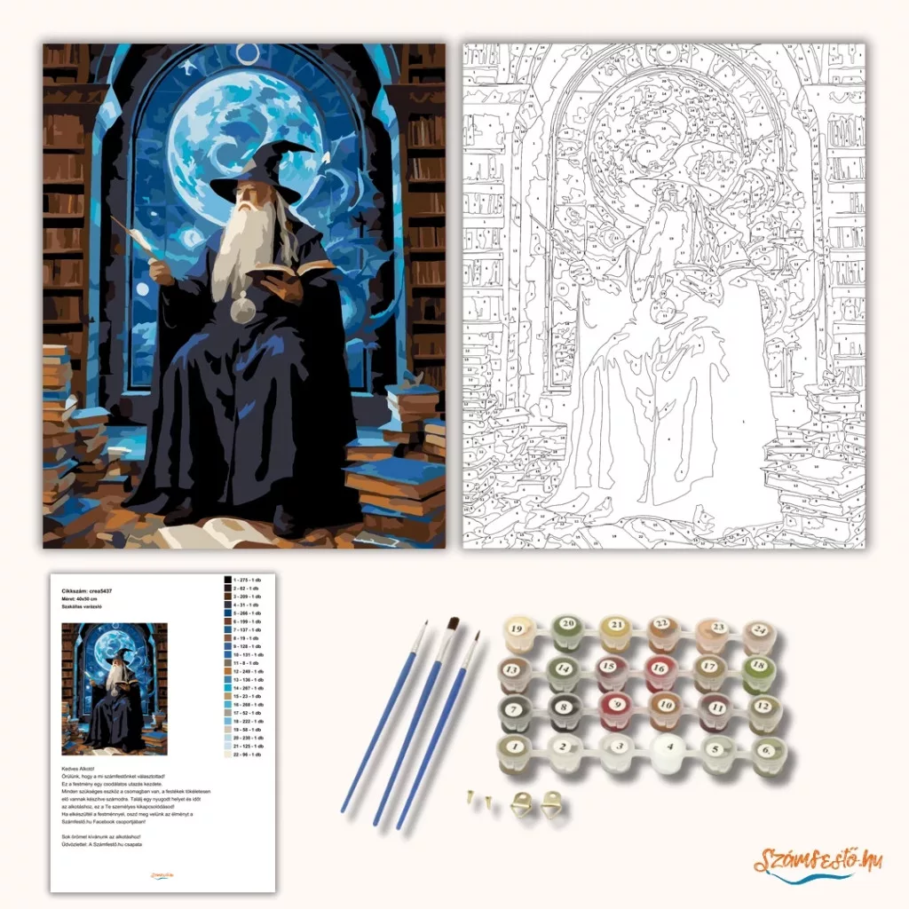 A képen egy idős varázsló ül egy torony könyvtárában, hosszú ezüst szakállal és hegyes kalapban, kezében pálcával és nyitott könyvvel. Körülötte könyvespolcok és könyvkupacok láthatók, a háttérben pedig egy hatalmas, kékesen fénylő hold ragyog az ablakon át. A jelenet misztikus, mesés hangulatú, hűvös kék tónusokkal és sötét árnyékokkal. Varázsolj egyedi hangulatot otthonodba ezzel a gyönyörű számfestő készlettel, amely tökéletes ajándék is lehet szeretteid számára. A csomag mindent tartalmaz, amire szükséged van ahhoz, hogy saját kezűleg alkoss egy lenyűgöző festményt.