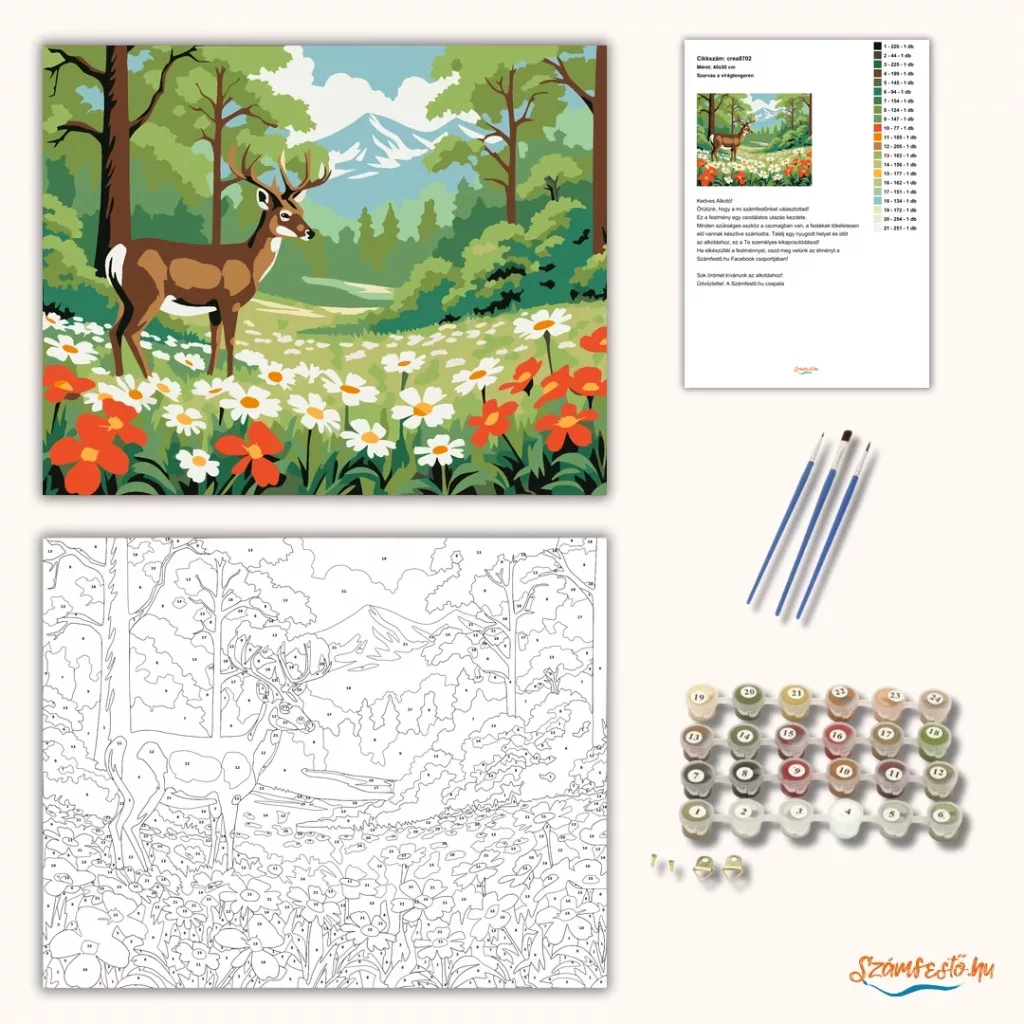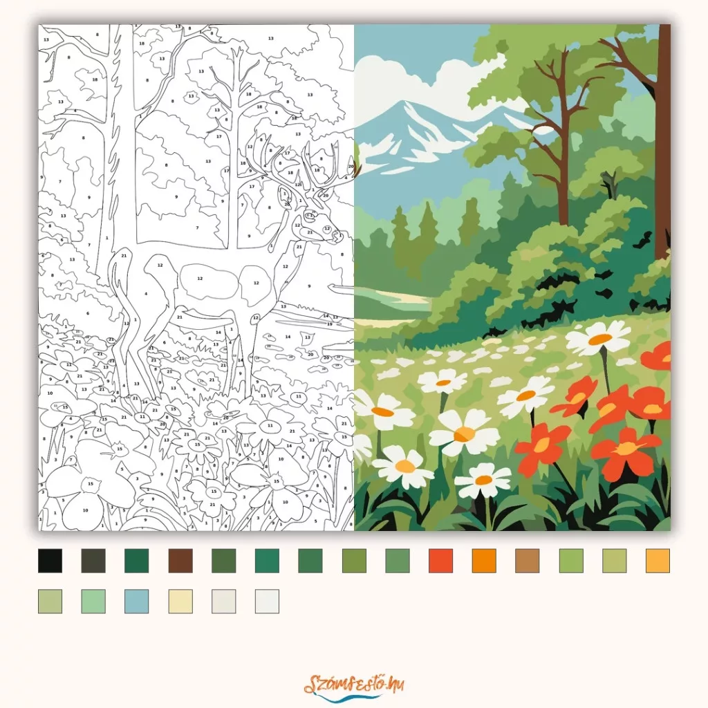 A képen egy szarvas áll egy tavaszi, virágokkal borított erdei tisztás szélén. A háttérben fenyők és távoli, havas hegycsúcsok láthatók a felhős ég alatt. A friss zöldek, a fehér margaréták és a piros virágok nyugodt, természetközeli hangulatot adnak. Legyen a lakásod dísze vagy egy kedves meglepetés valaki számára – ez a számfestő készlet tökéletes választás mindkettőre. A készletben mindent megtalálsz, amivel lépésről lépésre megalkotható ez a gyönyörű festmény.