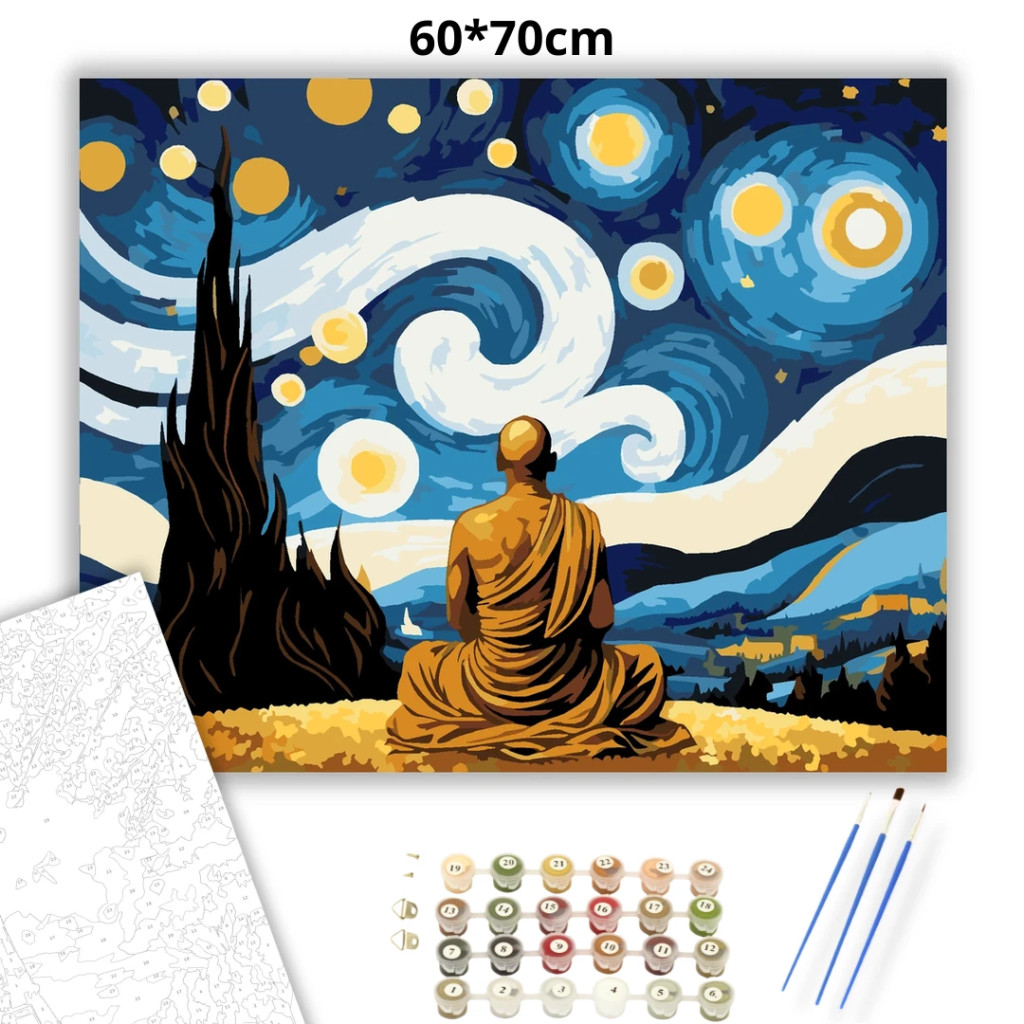 A képen egy szerzetes ül meditáló pózban, és a csillagos éjszakai égboltot figyeli, ahol nagy, örvénylő felhők és ragyogó körök kavarognak. A háttérben dombok és távoli házak rajzolódnak ki, a táj csendes és tágas. A mély kékek és a meleg arany fények nyugodt, elmélyült hangulatot teremtenek. Ez a számfestő készlet tökéletes választás, ha egyedi dekorációval tennéd szebbé otthonodat, vagy ha különleges ajándékot keresel. A csomagban minden megtalálható, amire a festéshez szükséged van.