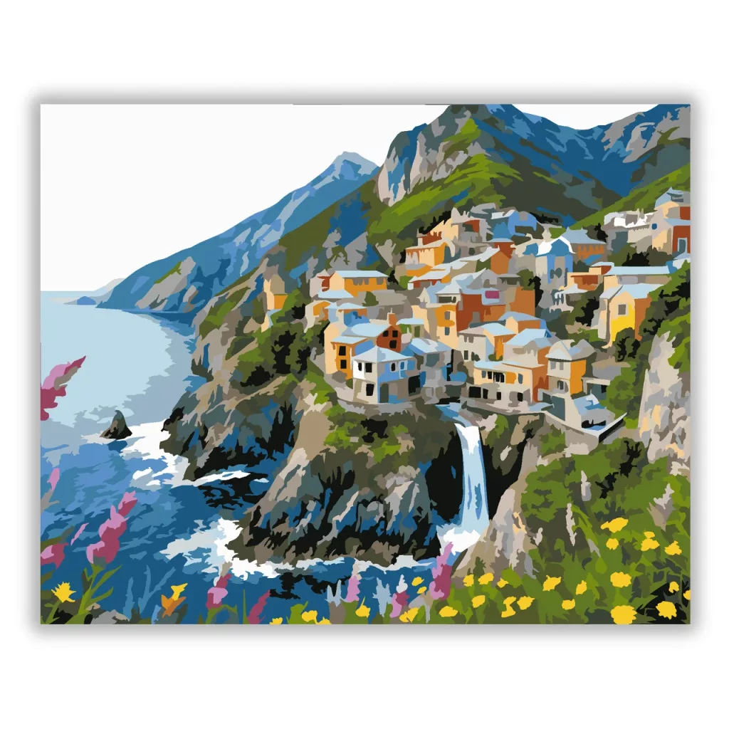 Sziklás tengerparti falu - számfestő készlet – 50×60 cm (Keret nélkül)
