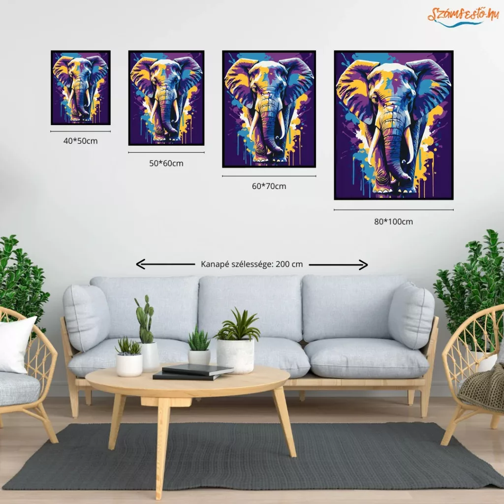 A képen egy szemből ábrázolt elefánt látható, nagy fülekkel és hosszú agyarakkal. A testét élénk, kontrasztos színek borítják, a háttérben fröccsenő és csorgó festékfoltokkal. Erőteljes, energikus hangulatú kép, ami azonnal magára vonja a tekintetet.