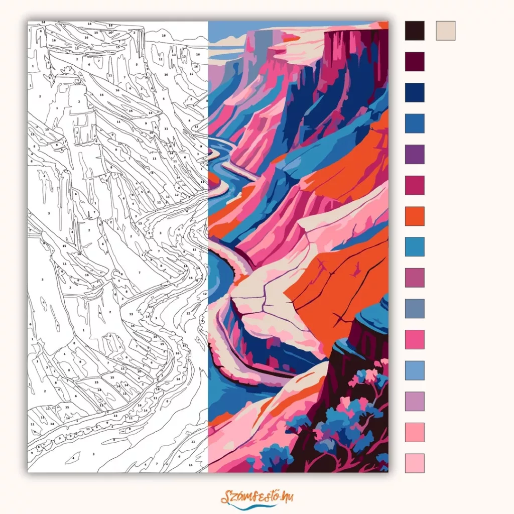 A képen egy mély kanyon látható, amelynek alján egy kanyargó folyó fut végig. A meredek sziklafalak élénk rózsaszín, narancs és kék árnyalatokban váltakoznak. A távolban felhők zárják le a látványt, a kép összhatása lendületes és látványos.