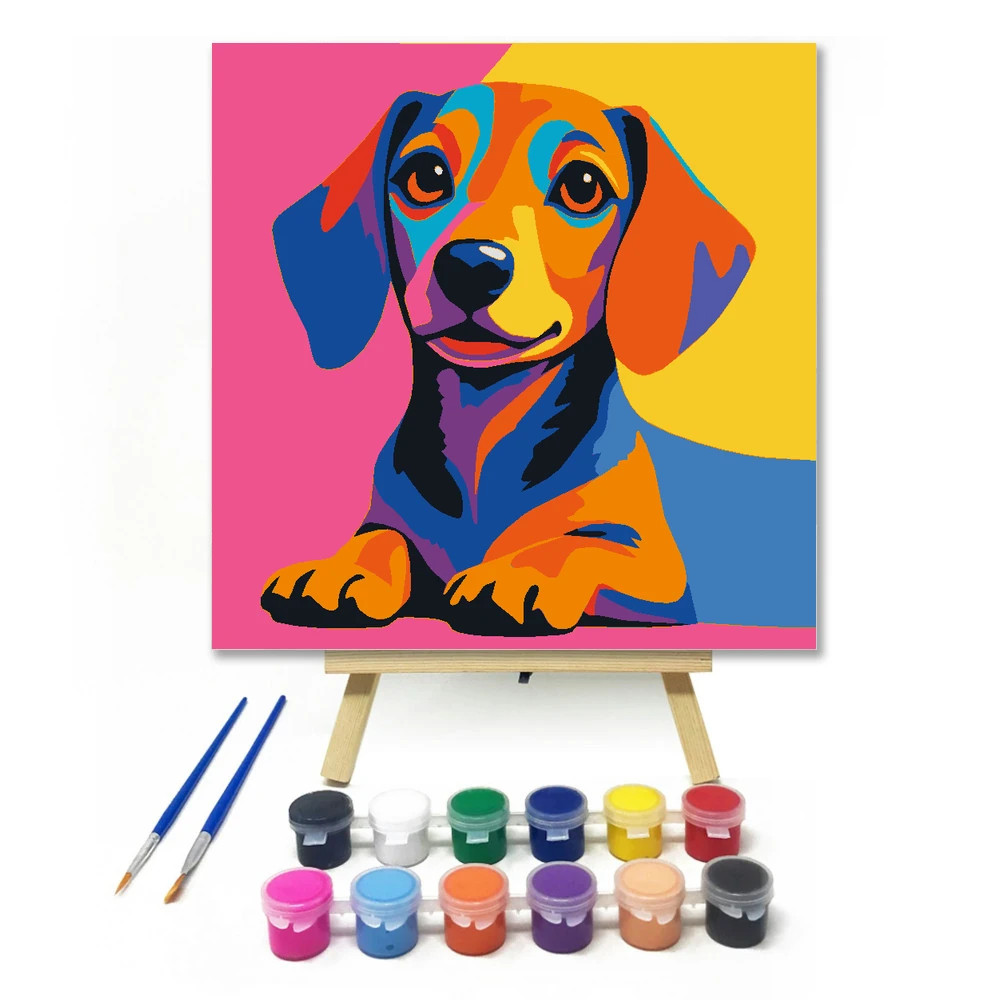 A képen egy vidám kiskutya portréja látható, nagy szemekkel és lógó fülekkel. A bundáján élénk narancs, kék, lila és fekete foltok váltakoznak. A háttér rózsaszín és sárga, ami igazán színes hangulatot ad. Legyen a lakásod dísze vagy egy kedves meglepetés valaki számára – ez a számfestő készlet tökéletes választás mindkettőre. A készletben mindent megtalálsz, amivel lépésről lépésre megalkotható ez a gyönyörű festmény.