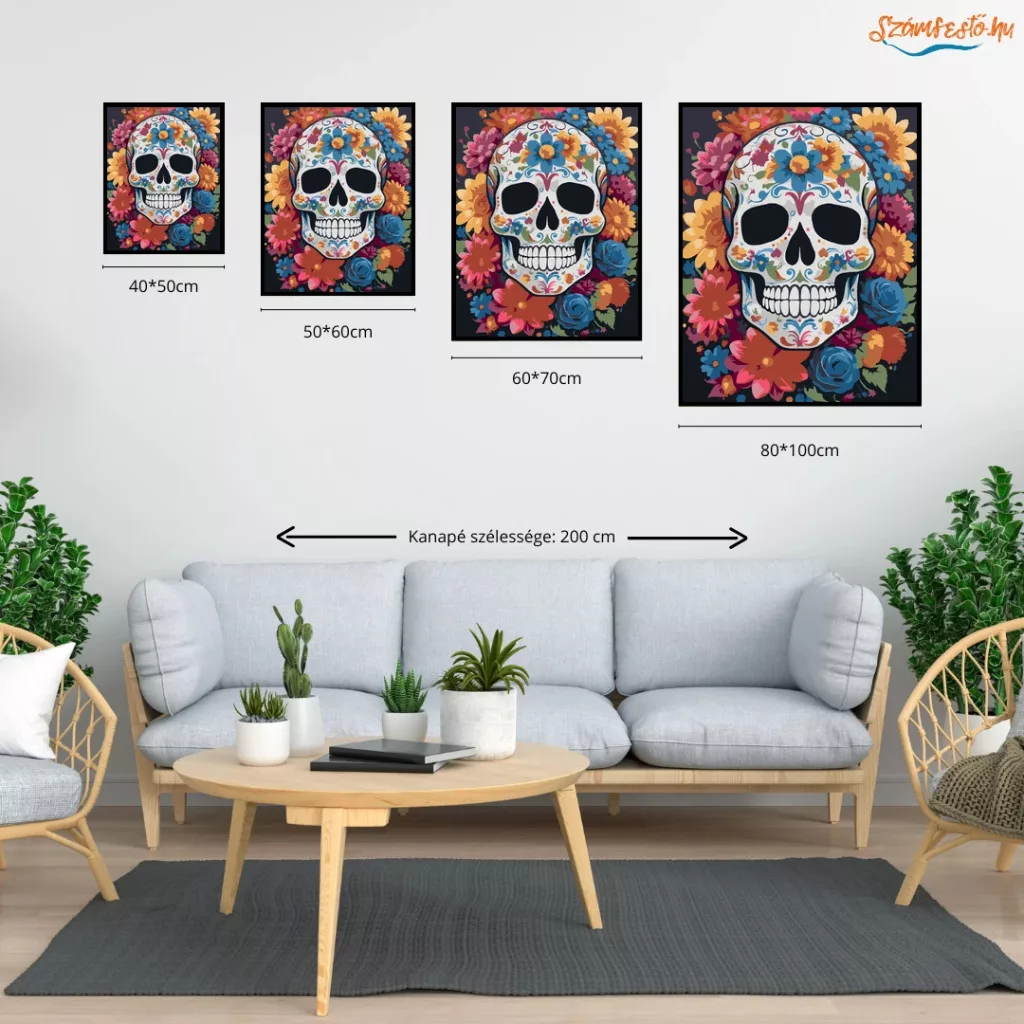 Színes virágkoszorús koponya - számfestő készlet - Számfestő.hu - 50×60cm - Keret nélkül