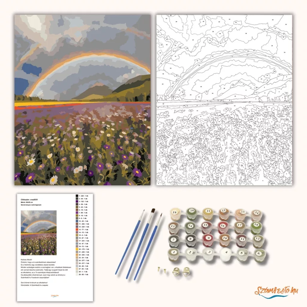 Egy hatalmas völgyet látni, ahol a vadvirágokkal teli mező egészen a távoli dombokig nyúlik. A borongós, felhős ég alatt egy széles szivárvány ível át a tájon. A lila és fehér virágokkal tarkított rét nyugodt, friss hangulatot áraszt. Díszítsd otthonodat saját kézzel készített műalkotással, vagy ajándékozd meg szeretteidet egy igazán különleges élménnyel! A számfestő készletben minden szükséges eszköz megtalálható a festmény elkészítéséhez.