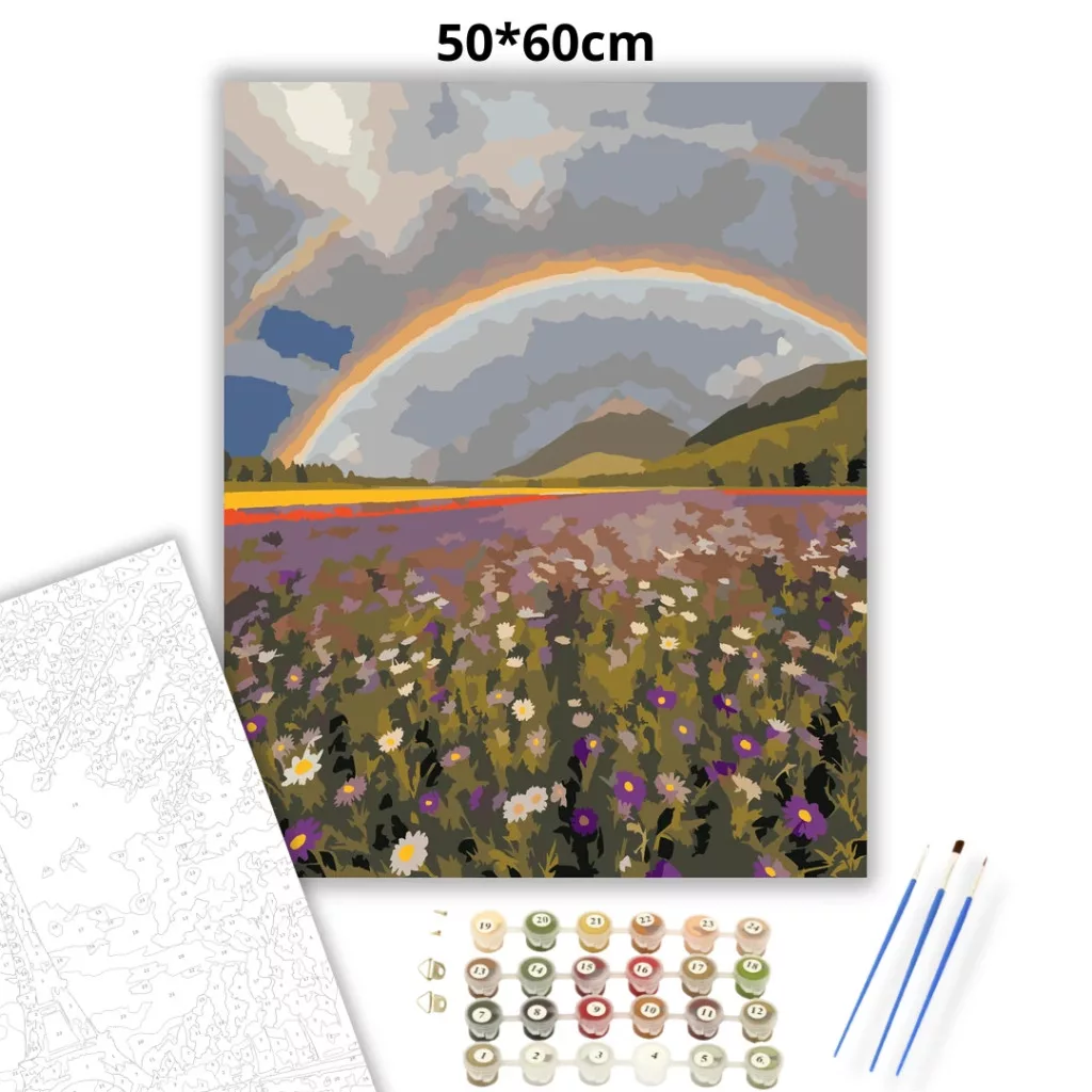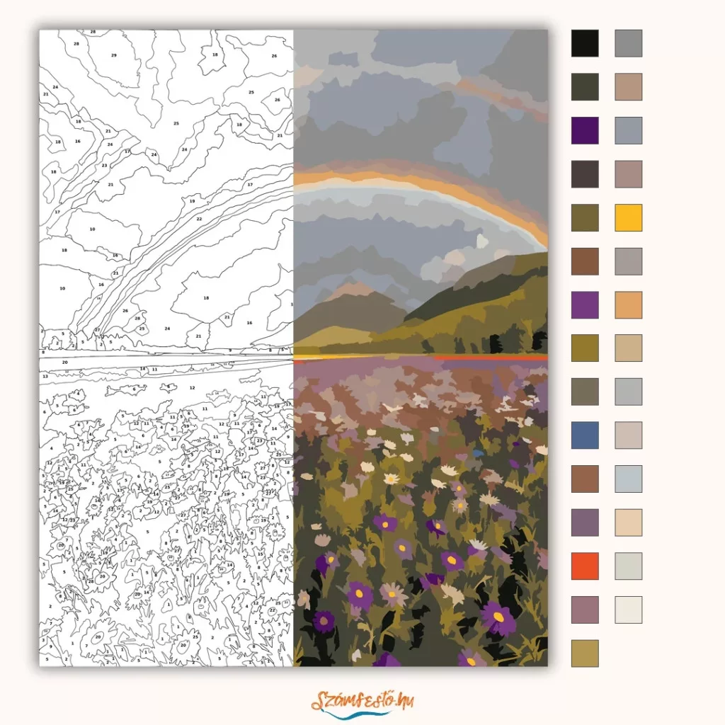 Egy hatalmas völgyet látni, ahol a vadvirágokkal teli mező egészen a távoli dombokig nyúlik. A borongós, felhős ég alatt egy széles szivárvány ível át a tájon. A lila és fehér virágokkal tarkított rét nyugodt, friss hangulatot áraszt. Engedd szabadjára a kreativitásodat, és alkoss egy különleges műalkotást, amely otthonod dísze lehet de egyedi ajándékként is kiváló. A számfestő készletben minden szükséges eszközt megtalálsz a tökéletes végeredményhez.