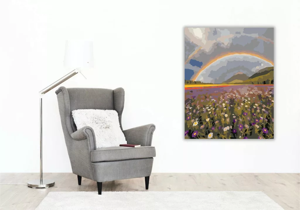 Egy hatalmas völgyet látni, ahol a vadvirágokkal teli mező egészen a távoli dombokig nyúlik. A borongós, felhős ég alatt egy széles szivárvány ível át a tájon. A lila és fehér virágokkal tarkított rét nyugodt, friss hangulatot áraszt. Legyen a lakásod dísze vagy egy kedves meglepetés valaki számára – ez a számfestő készlet tökéletes választás mindkettőre. A készletben mindent megtalálsz, amivel lépésről lépésre megalkotható ez a gyönyörű festmény.