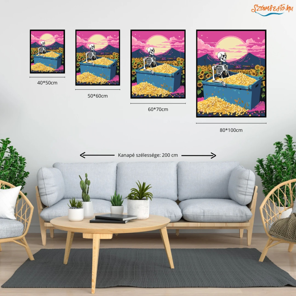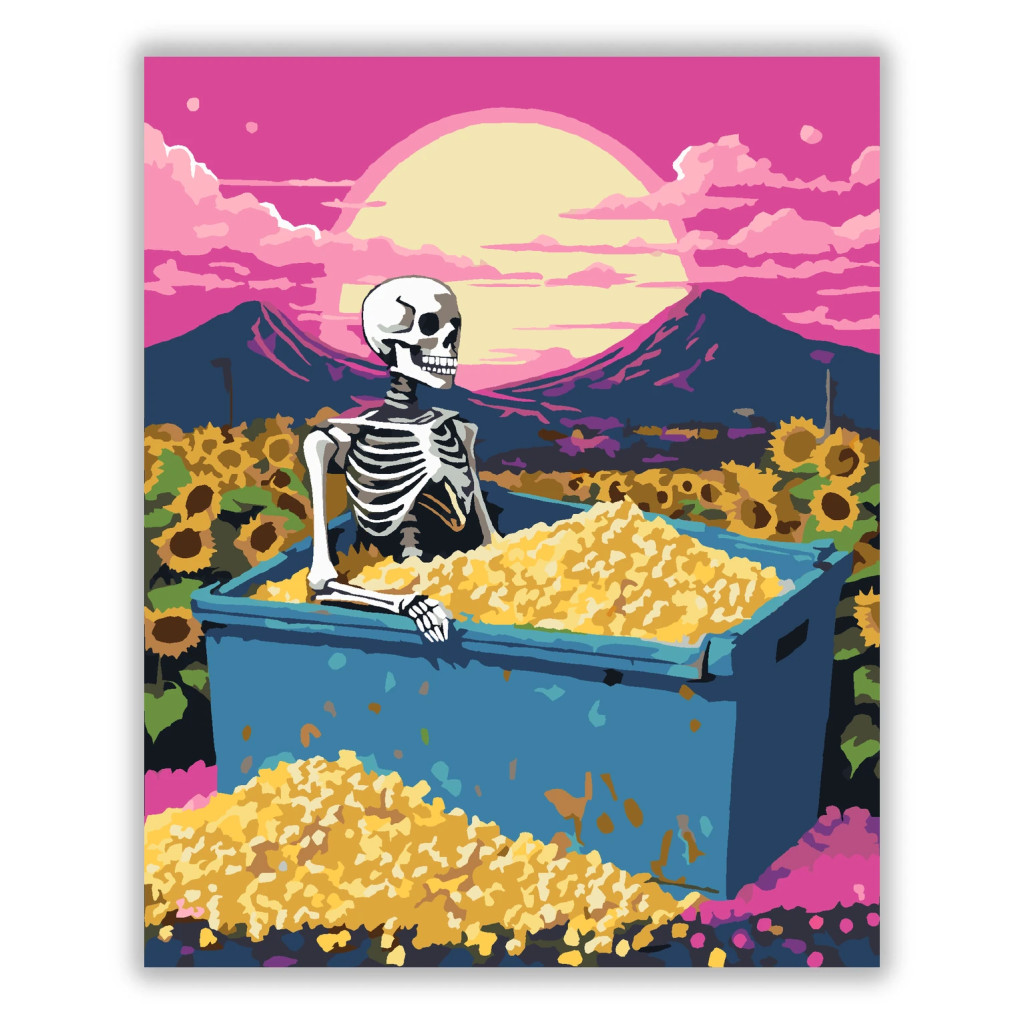 A képen egy csontváz látható, amint egy kék konténerben ül, amely tele van pattogatott kukoricával. A háttérben naplemente, hegyek és felhők látszanak, a konténer körül pedig napraforgók nyílnak. Az egész jelenet játékos és különleges hangulatú, erős, feltűnő színekkel. Díszítsd otthonodat saját kézzel készített műalkotással, vagy ajándékozd meg szeretteidet egy igazán különleges élménnyel! A számfestő készletben minden szükséges eszköz megtalálható a festmény elkészítéséhez.