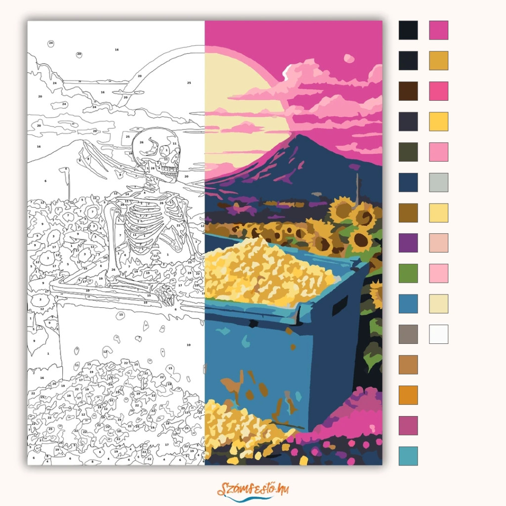 A képen egy csontváz látható, amint egy kék konténerben ül, amely tele van pattogatott kukoricával. A háttérben naplemente, hegyek és felhők látszanak, a konténer körül pedig napraforgók nyílnak. Az egész jelenet játékos és különleges hangulatú, erős, feltűnő színekkel. Legyen a lakásod dísze vagy egy kedves meglepetés valaki számára – ez a számfestő készlet tökéletes választás mindkettőre. A készletben mindent megtalálsz, amivel lépésről lépésre megalkotható ez a gyönyörű festmény.