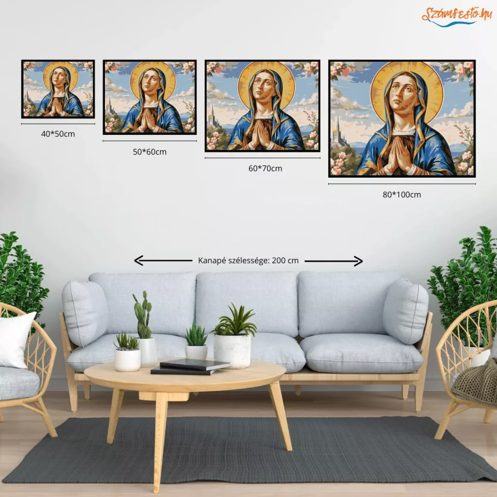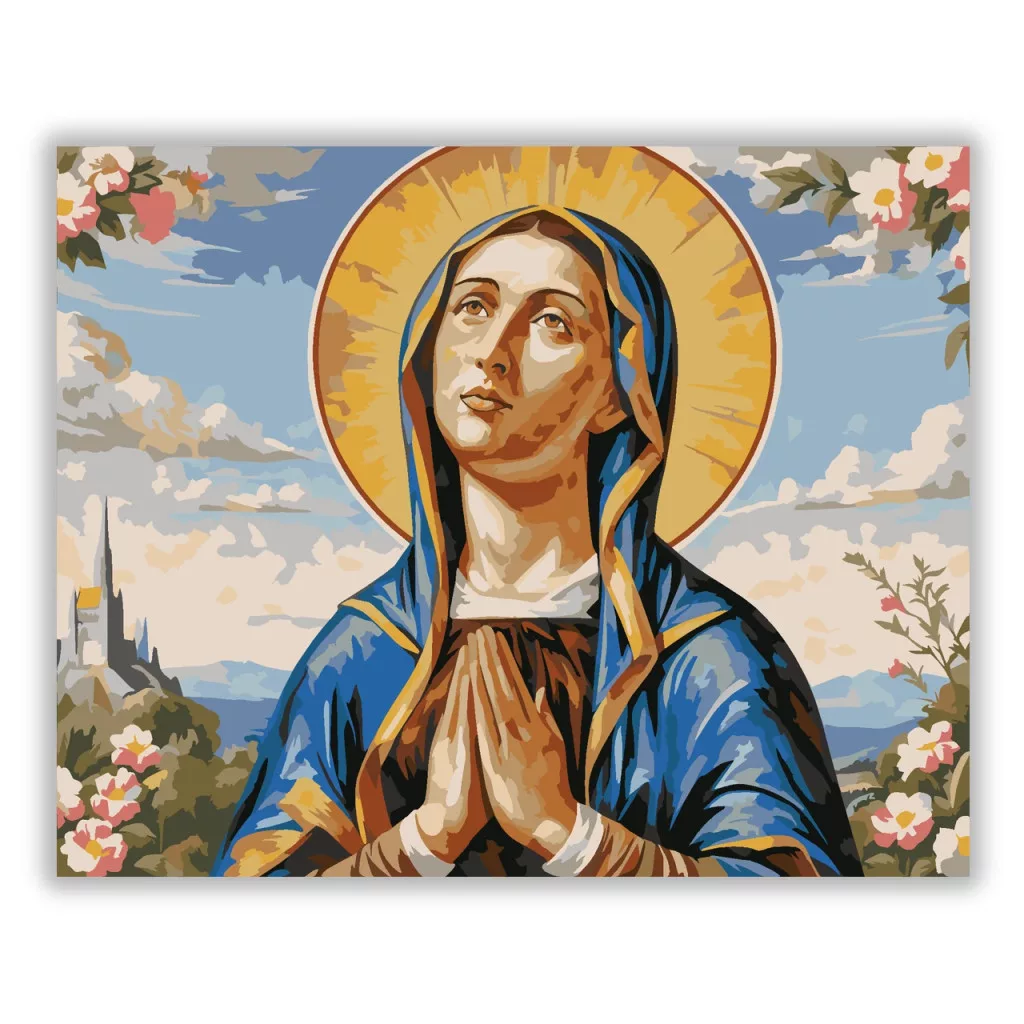 A képen a Szűz Mária látható összetett kézzel, arany fénykoszorúval a feje körül. A háttérben felhős ég és távoli templomtornyok rajzolódnak ki. A jelenetet virágok keretezik, a hangulat csendes és áhítatos. Varázsolj egyedi hangulatot otthonodba ezzel a gyönyörű számfestő készlettel, amely tökéletes ajándék is lehet szeretteid számára. A csomag mindent tartalmaz, amire szükséged van ahhoz, hogy saját kezűleg alkoss egy lenyűgöző festményt.