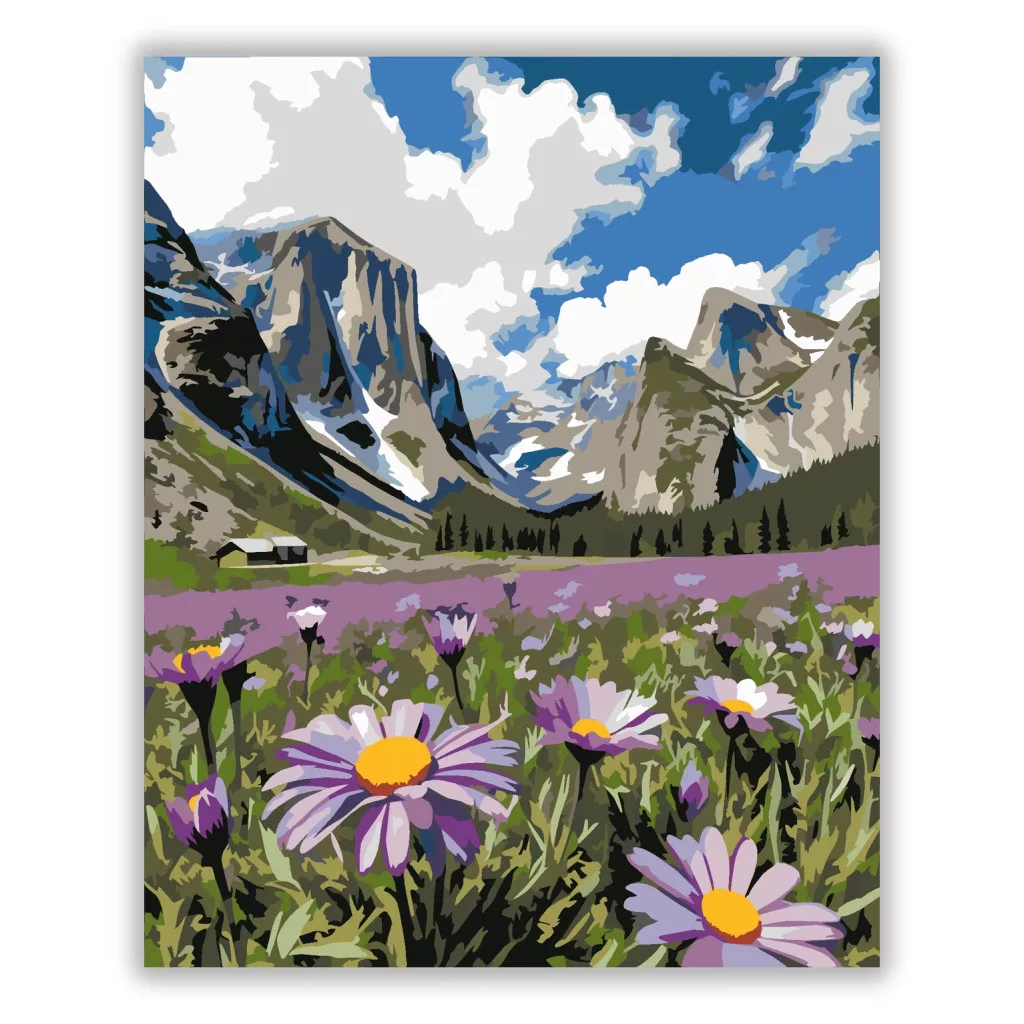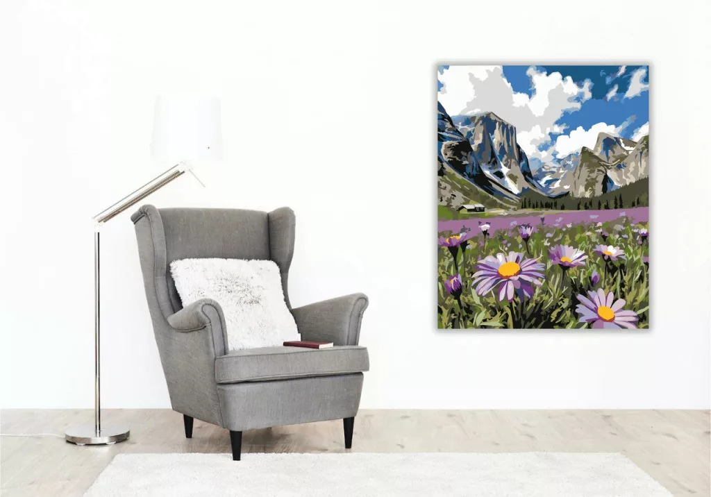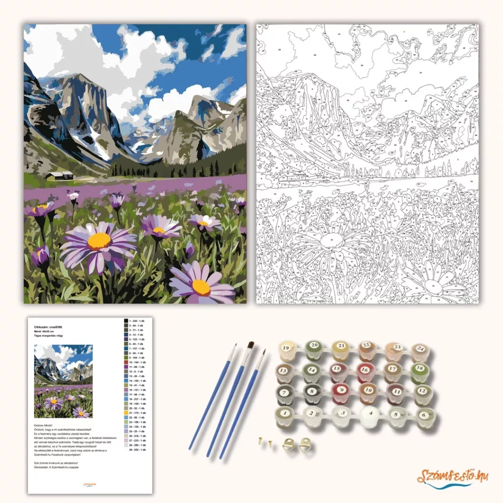 A képen egy hegyekkel ölelt völgy tárul fel, a távolban sziklás csúcsokkal és felhős éggel. Az előtérben margaréták és vadvirágok nyílnak, mellettük egy lila virágmező húzódik. A látvány friss, tágas és természetközeli hangulatot ad. Varázsolj egyedi hangulatot otthonodba ezzel a gyönyörű számfestő készlettel, amely tökéletes ajándék is lehet szeretteid számára. A csomag mindent tartalmaz, amire szükséged van ahhoz, hogy saját kezűleg alkoss egy lenyűgöző festményt.