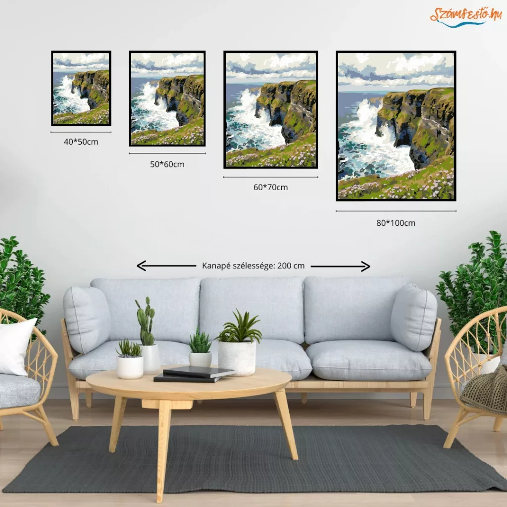 A képen hatalmas, zöld sziklafalak láthatók, amelyek meredeken zuhannak a hullámzó tengerbe. A partnál fehér tajték csap fel a sziklákra, fölötte pedig vastag, viharos felhők borítják az eget. A látvány egyszerre vad és lenyűgöző, igazi óceánparti hangulattal. Díszítsd otthonodat saját kézzel készített műalkotással, vagy ajándékozd meg szeretteidet egy igazán különleges élménnyel! A számfestő készletben minden szükséges eszköz megtalálható a festmény elkészítéséhez.