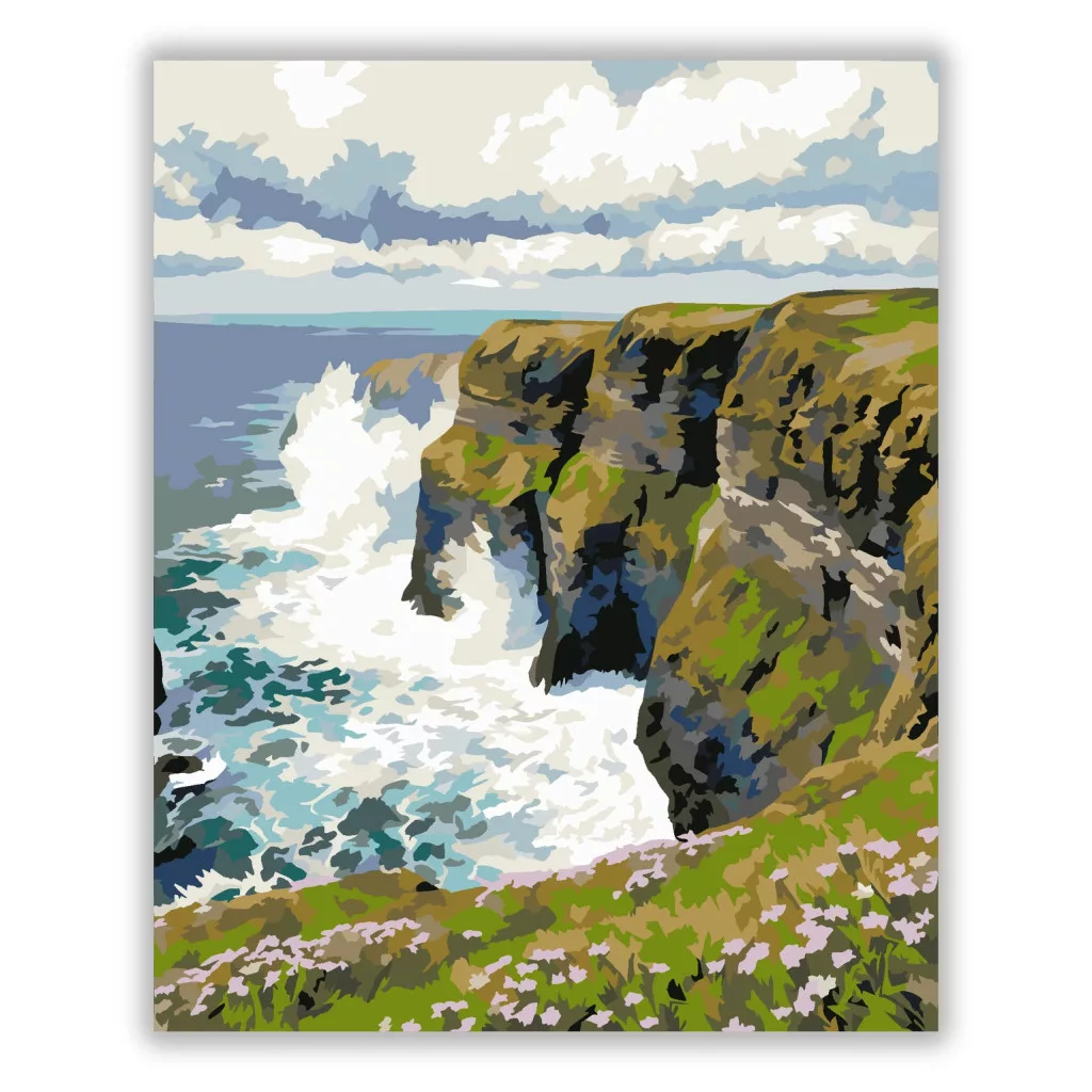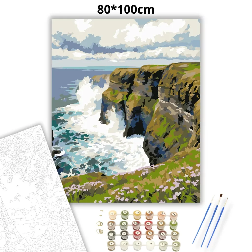 A képen hatalmas, zöld sziklafalak láthatók, amelyek meredeken zuhannak a hullámzó tengerbe. A partnál fehér tajték csap fel a sziklákra, fölötte pedig vastag, viharos felhők borítják az eget. A látvány egyszerre vad és lenyűgöző, igazi óceánparti hangulattal. Varázsolj egyedi hangulatot otthonodba ezzel a gyönyörű számfestő készlettel, amely tökéletes ajándék is lehet szeretteid számára. A csomag mindent tartalmaz, amire szükséged van ahhoz, hogy saját kezűleg alkoss egy lenyűgöző festményt.