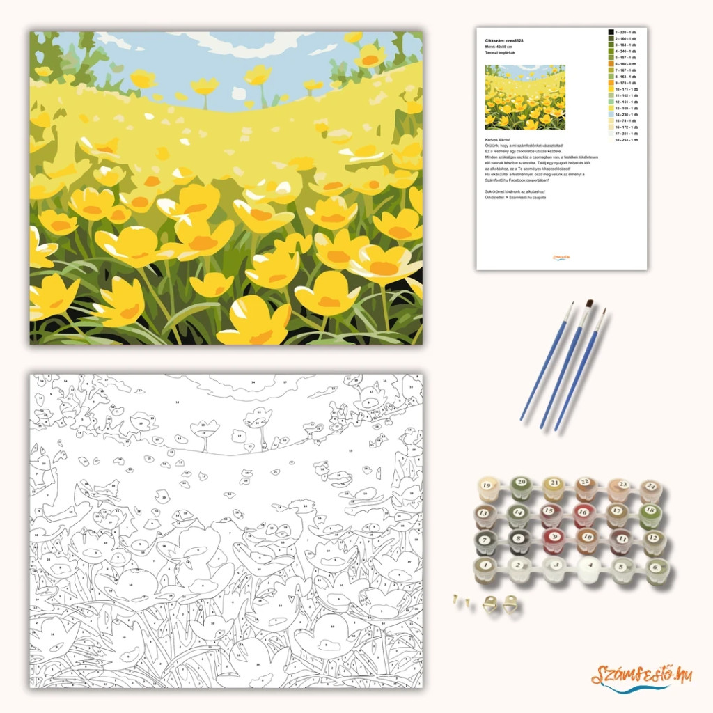 A képen egy napsütötte mező látható, tele vadon nyíló boglárkákkal és zöld fűvel. A sárga virágok szinte beborítják a domboldalt, a háttérben világos ég és puha felhők jelennek meg. Friss, tavaszi hangulatot hoz bármelyik szobába. Ez a számfestő készlet tökéletes választás, ha egyedi dekorációval tennéd szebbé otthonodat, vagy ha különleges ajándékot keresel. A csomagban minden megtalálható, amire a festéshez szükséged van.