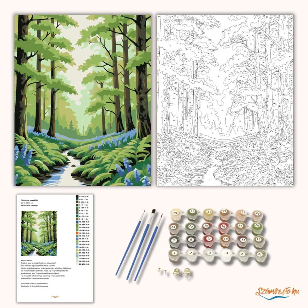 A képen egy keskeny erdei patak kanyarog a magas fák között, friss tavaszi lombok alatt. A víz a világos, zöldes fényt tükrözi, a parton dús növényzet és apró kék virágok láthatók. Nyugodt, üde hangulatú jelenet, ami a természet csendjét hozza a falra. Díszítsd otthonodat saját kézzel készített műalkotással, vagy ajándékozd meg szeretteidet egy igazán különleges élménnyel! A számfestő készletben minden szükséges eszköz megtalálható a festmény elkészítéséhez.