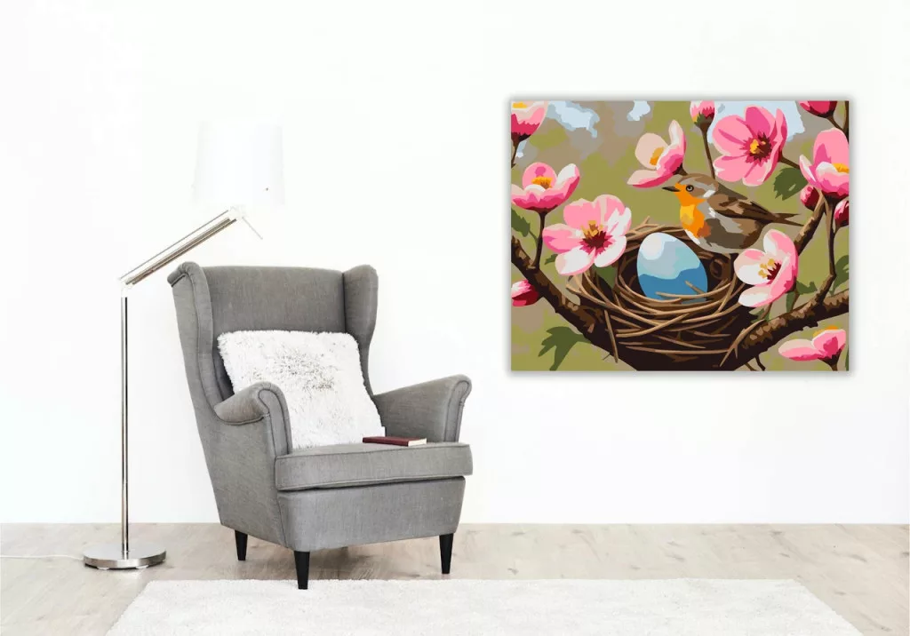 A képen egy kismadár ül egy apró fészek peremén, benne egy kék tojással, virágzó ágak között. A rózsaszín virágok és a friss tavaszi hangulat otthonossá és derűssé teszik a látványt. Meleg barnák, lágy zöldek és élénk virágszínek adják a kép kedves hangulatát. Díszítsd otthonodat saját kézzel készített műalkotással, vagy ajándékozd meg szeretteidet egy igazán különleges élménnyel! A számfestő készletben minden szükséges eszköz megtalálható a festmény elkészítéséhez.