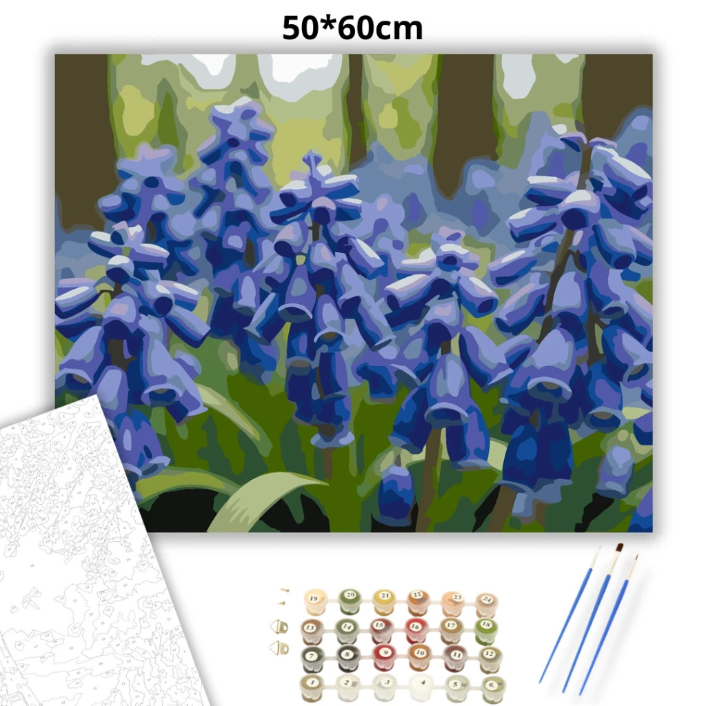 A képen tavaszi gyöngyikék láthatók, apró harang alakú virágokkal, egy kerítésoszlop közelében. A sok virág együtt friss, üde kerti hangulatot ad. A mély kékes-lilás tónusokat lágy zöld háttér egészíti ki. Varázsolj egyedi hangulatot otthonodba ezzel a gyönyörű számfestő készlettel, amely tökéletes ajándék is lehet szeretteid számára. A csomag mindent tartalmaz, amire szükséged van ahhoz, hogy saját kezűleg alkoss egy lenyűgöző festményt.