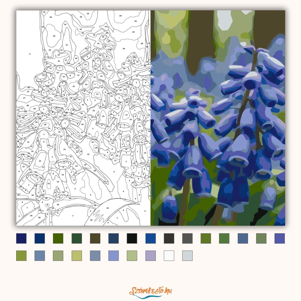 A képen tavaszi gyöngyikék láthatók, apró harang alakú virágokkal, egy kerítésoszlop közelében. A sok virág együtt friss, üde kerti hangulatot ad. A mély kékes-lilás tónusokat lágy zöld háttér egészíti ki. Díszítsd otthonodat saját kézzel készített műalkotással, vagy ajándékozd meg szeretteidet egy igazán különleges élménnyel! A számfestő készletben minden szükséges eszköz megtalálható a festmény elkészítéséhez.