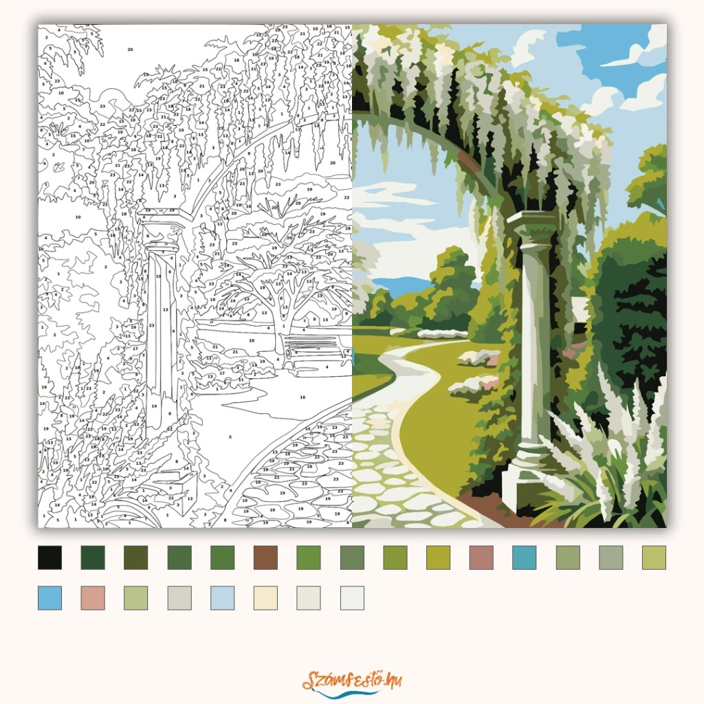 A képen egy tavaszi kert látható, ahol egy virágzó fehér lilaakáccal befuttatott kerti boltív nyílik a zöld parkra. A kanyargó kőösvény egy padhoz és egy fehér virágú fához vezet. Friss, nyugodt hangulatot áraszt a sok zöld és a világos égbolt. Varázsolj egyedi hangulatot otthonodba ezzel a gyönyörű számfestő készlettel, amely tökéletes ajándék is lehet szeretteid számára. A csomag mindent tartalmaz, amire szükséged van ahhoz, hogy saját kezűleg alkoss egy lenyűgöző festményt.