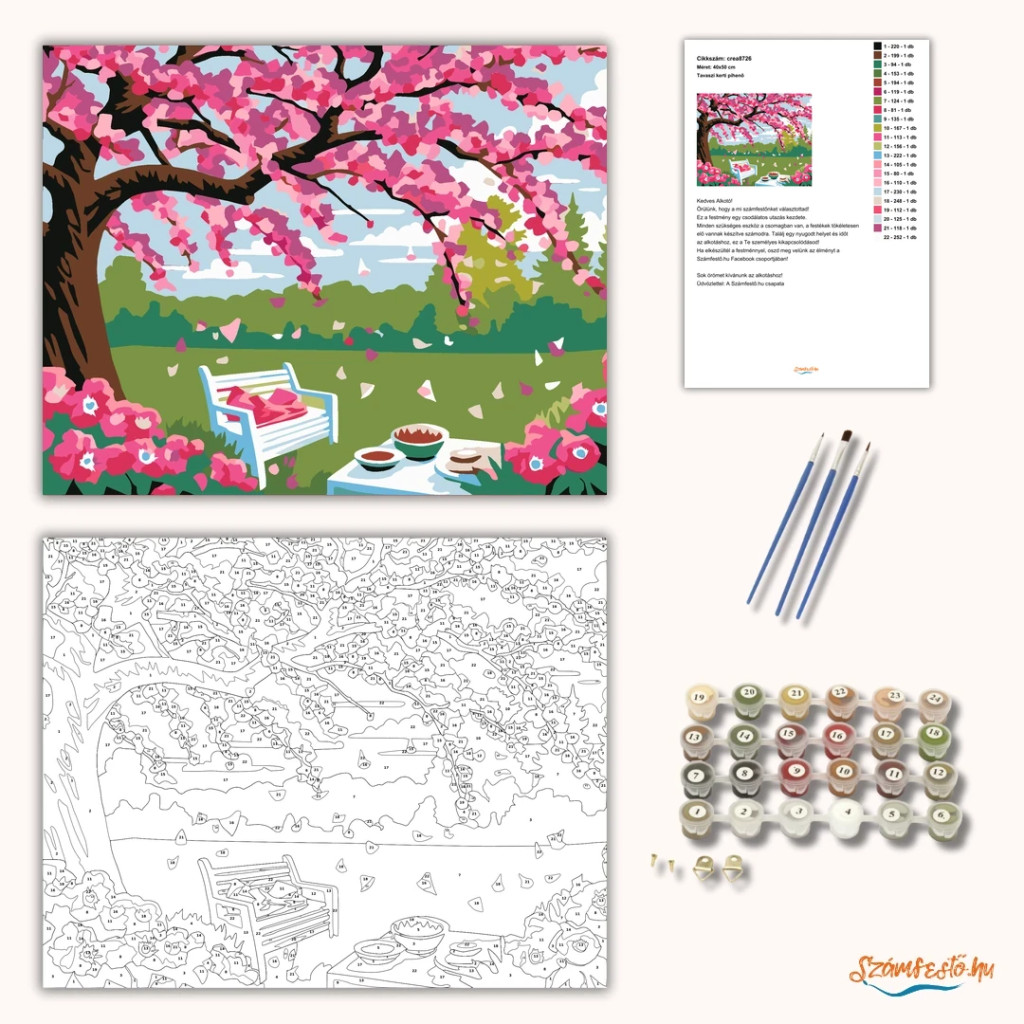 Egy tavaszi piknikjelenet látható egy virágzó szilvafa alatt, ahol a szirmok finoman hullanak a fűre. A kertben egy fehér pad és egy megterített asztal idézi a nyugodt, pihentető délutánt. A rózsaszín virágok és a friss zöld háttér igazán üde hangulatot adnak a képnek. Ez a számfestő készlet tökéletes választás, ha egyedi dekorációval tennéd szebbé otthonodat, vagy ha különleges ajándékot keresel. A csomagban minden megtalálható, amire a festéshez szükséged van.